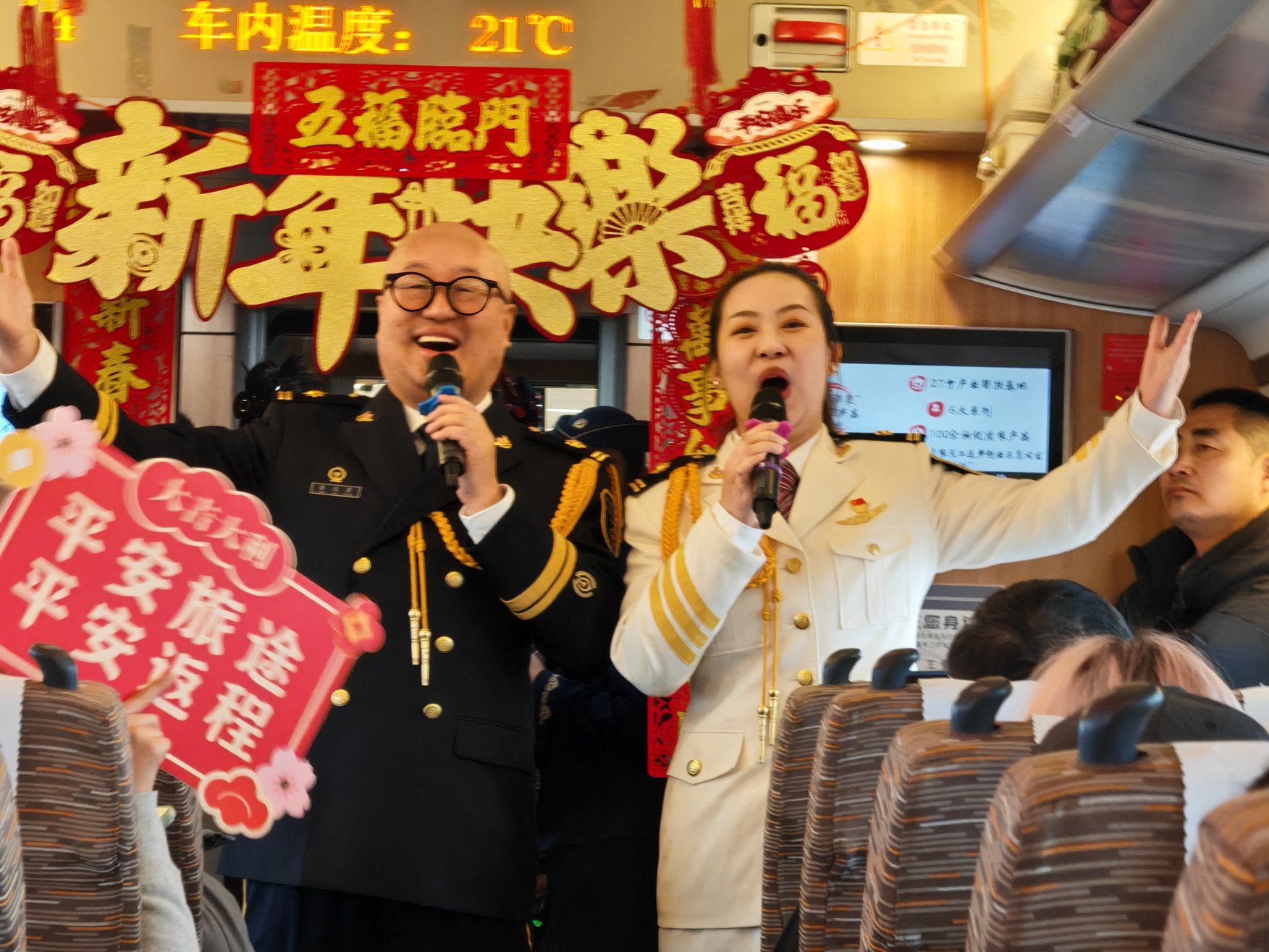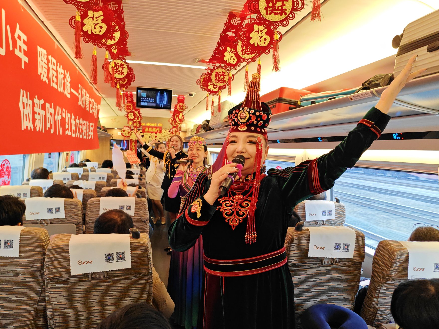 (2026年春节期间,呼铁乌兰牧骑登上列车与旅客共度佳节。张宝珍 摄)
