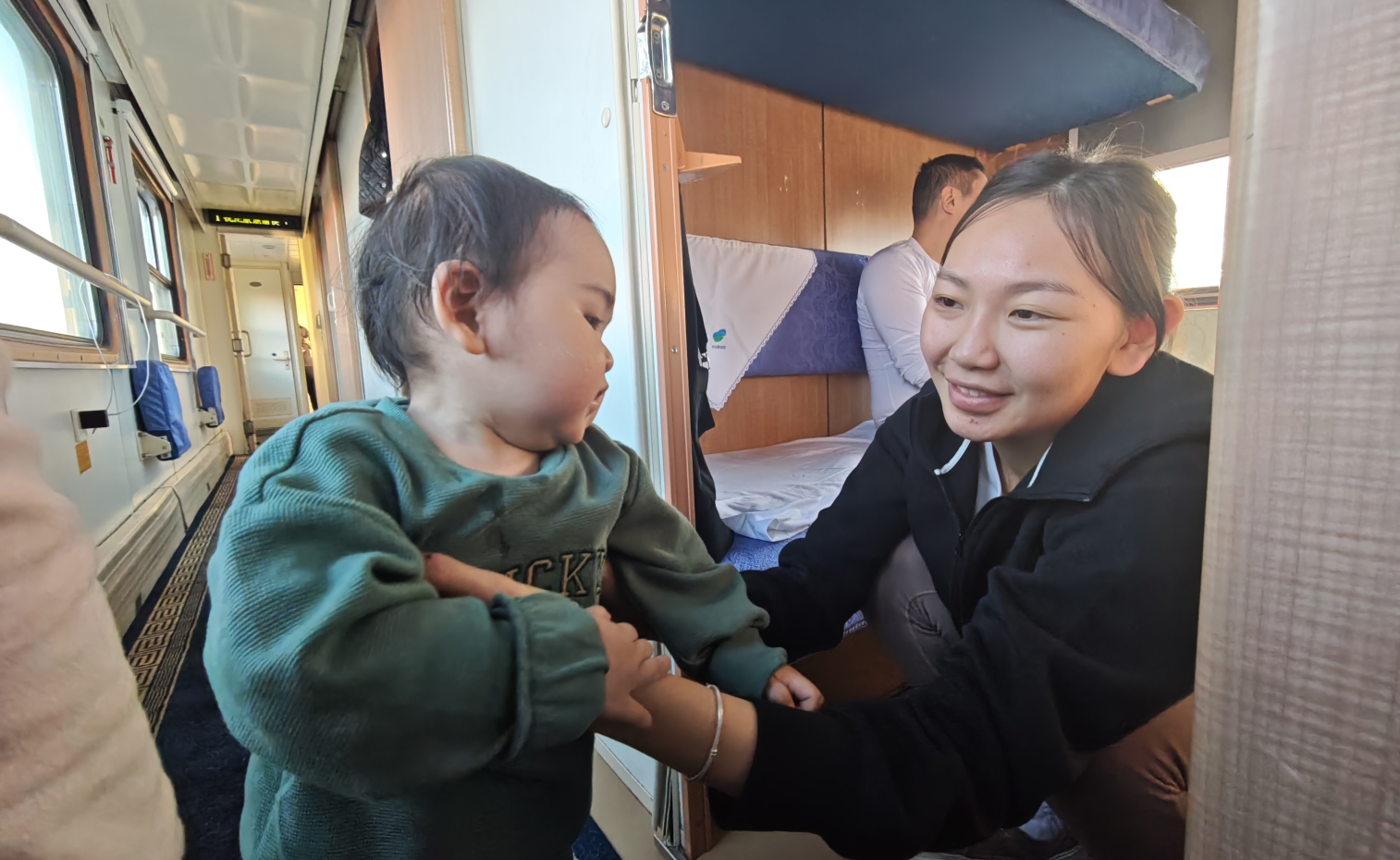 (列车上,到呼和浩特就医的蒙古国旅客格勒图雅笑容灿烂。张月 摄)