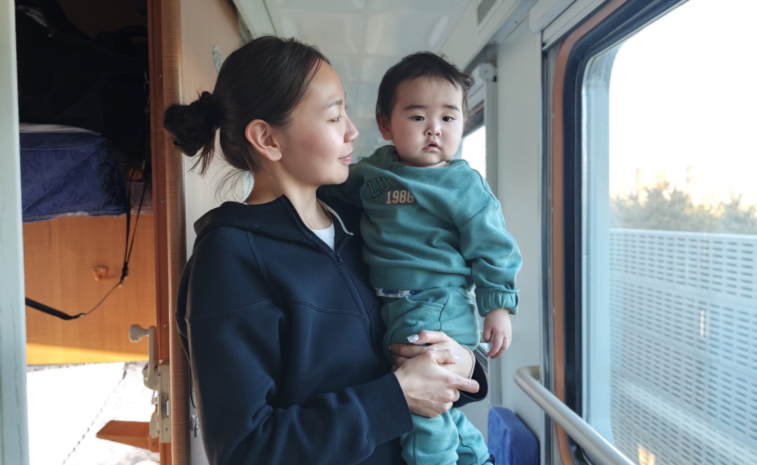 (蒙古国旅客图勒额尔敦与幼子合影。张月 摄)