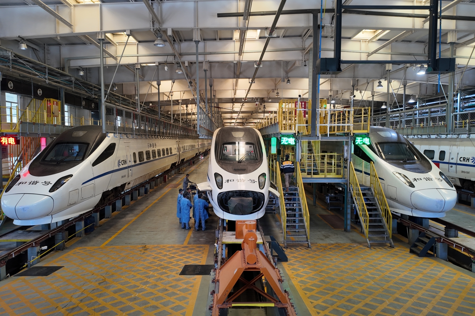 (动车组机械师正在检查螺栓防松线。张道勤 摄)