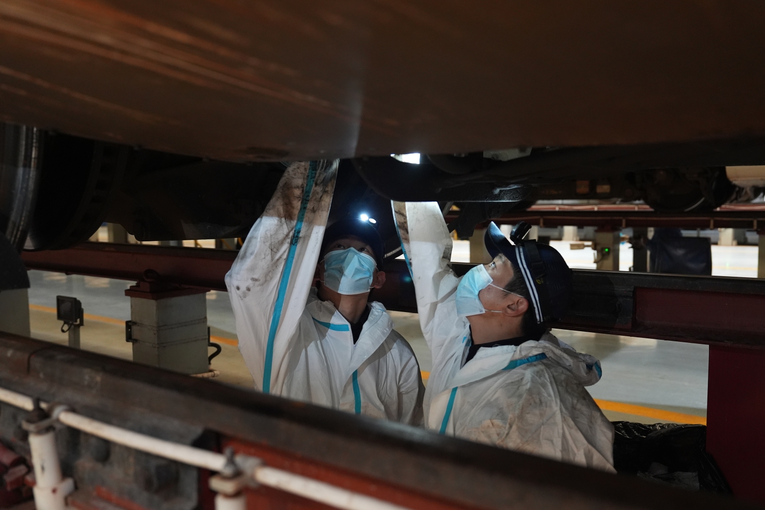 (动车组机械师正在对车底走行部进行细致检查。张道勤 摄)