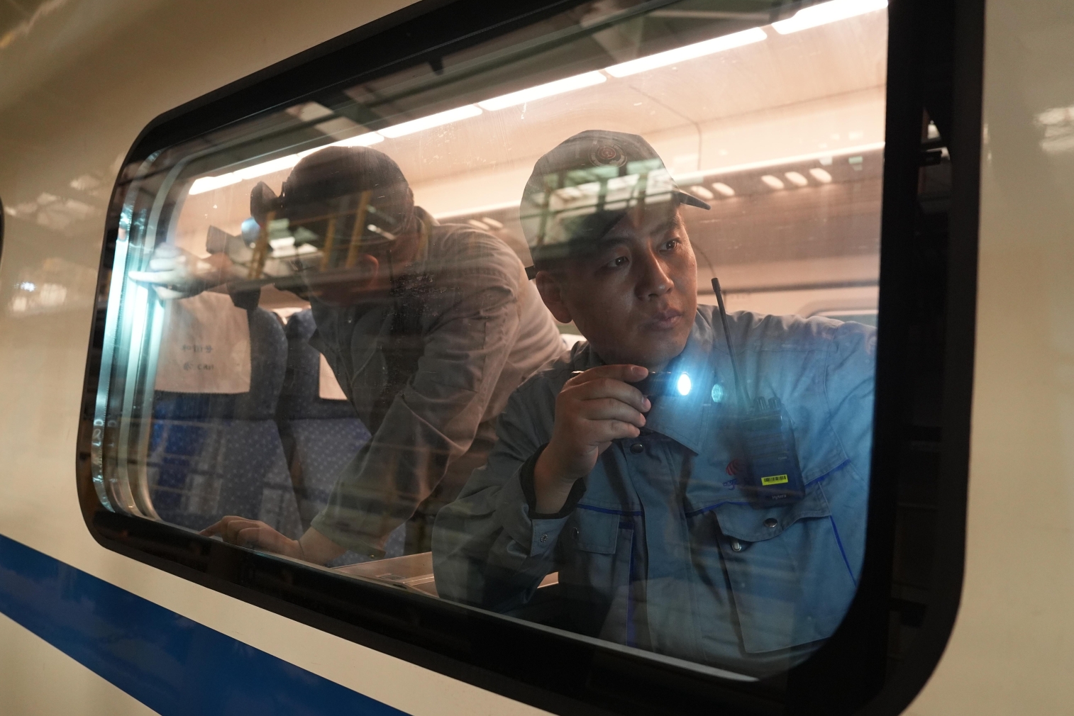 (动车组机械师检查车窗密封性是否良好。张道勤 摄)