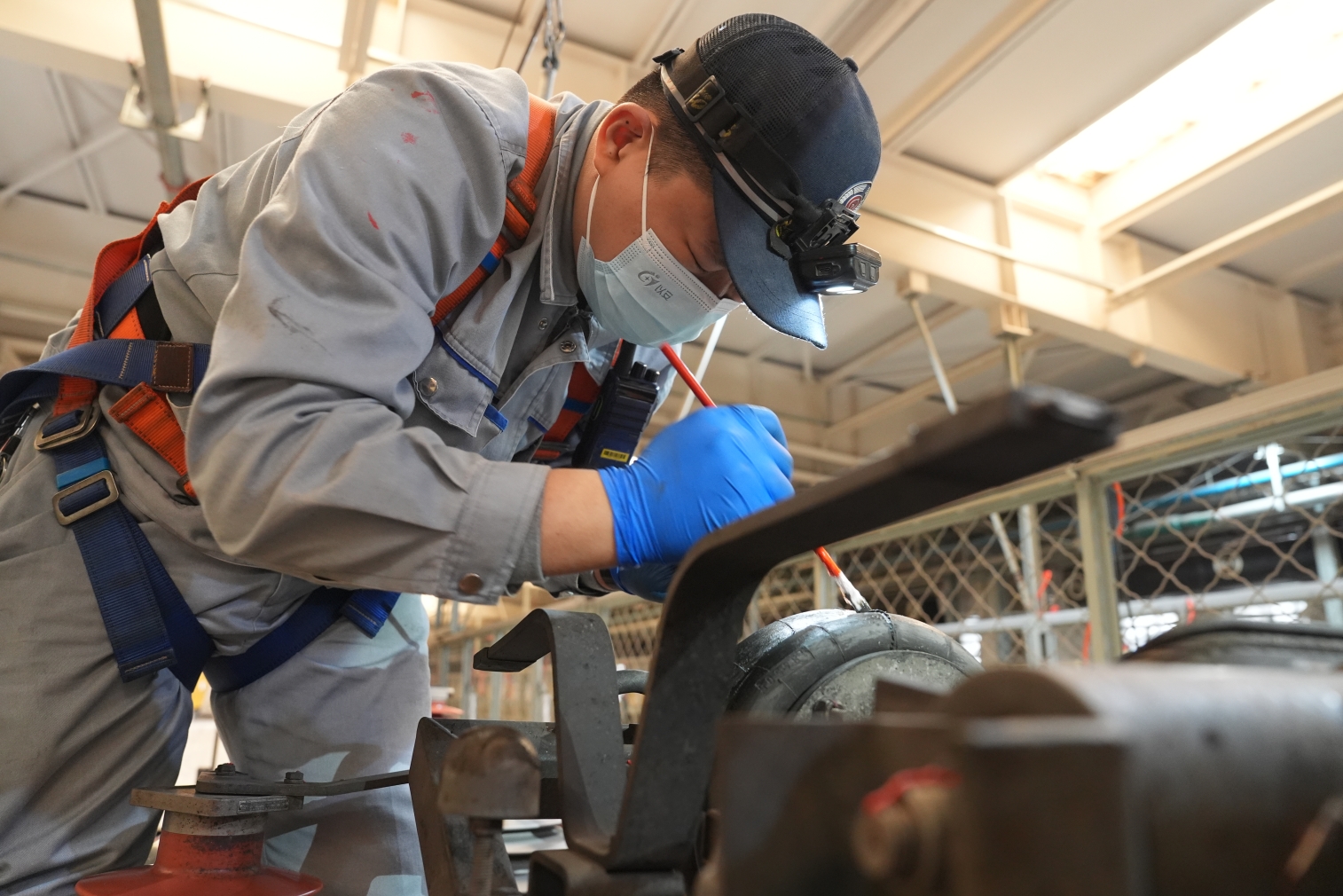 (动车组机械师检查受电弓性能状态是否良好。张道勤 摄)