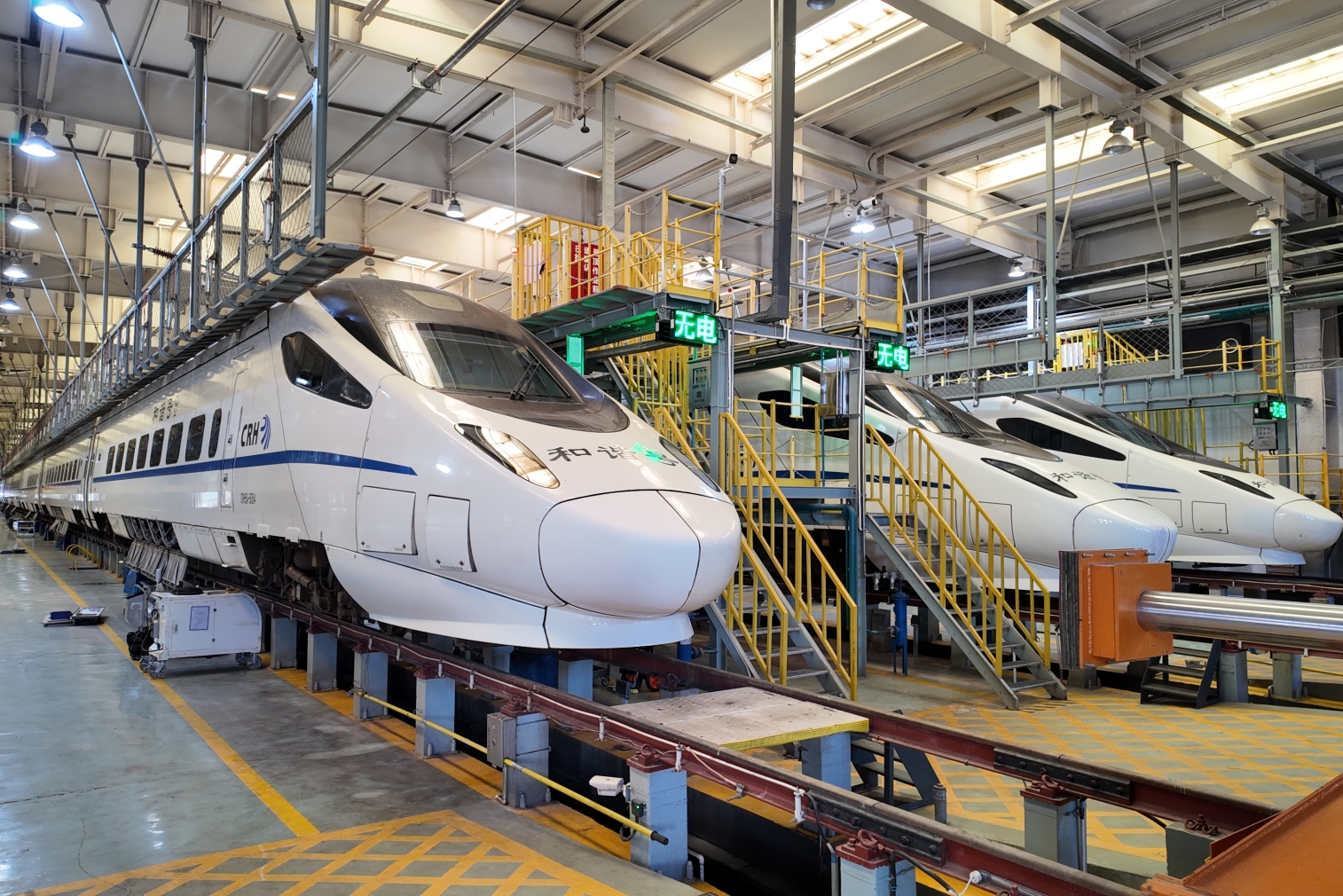 (包头车辆段机械师正在检查动车组转向架关键部件。张道勤 摄)