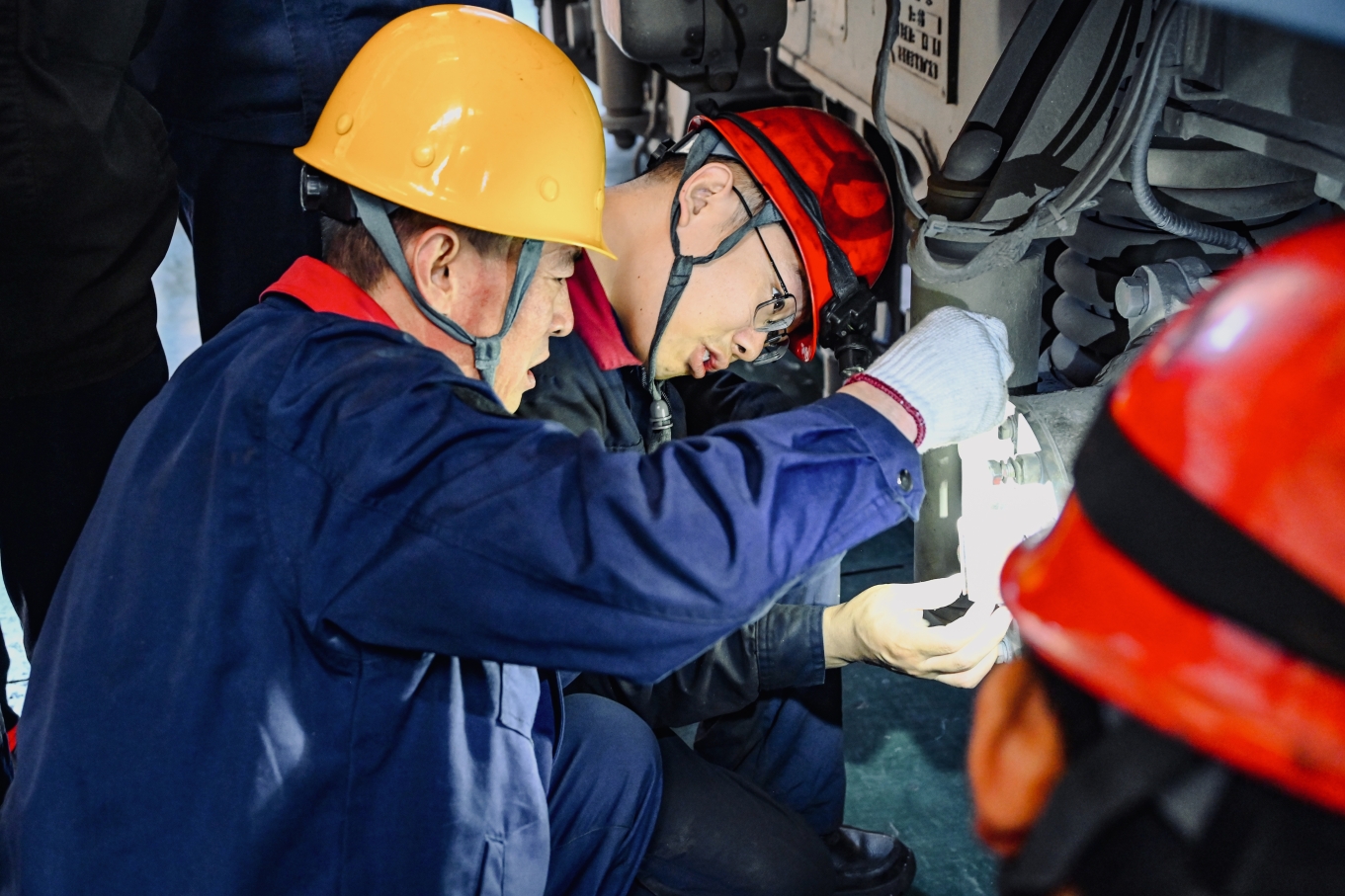 (大板机务段检修车间职工对走行部轴箱装置进行检查。牛鹏成 摄)