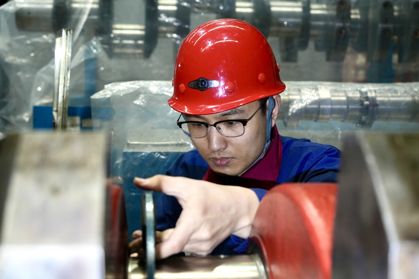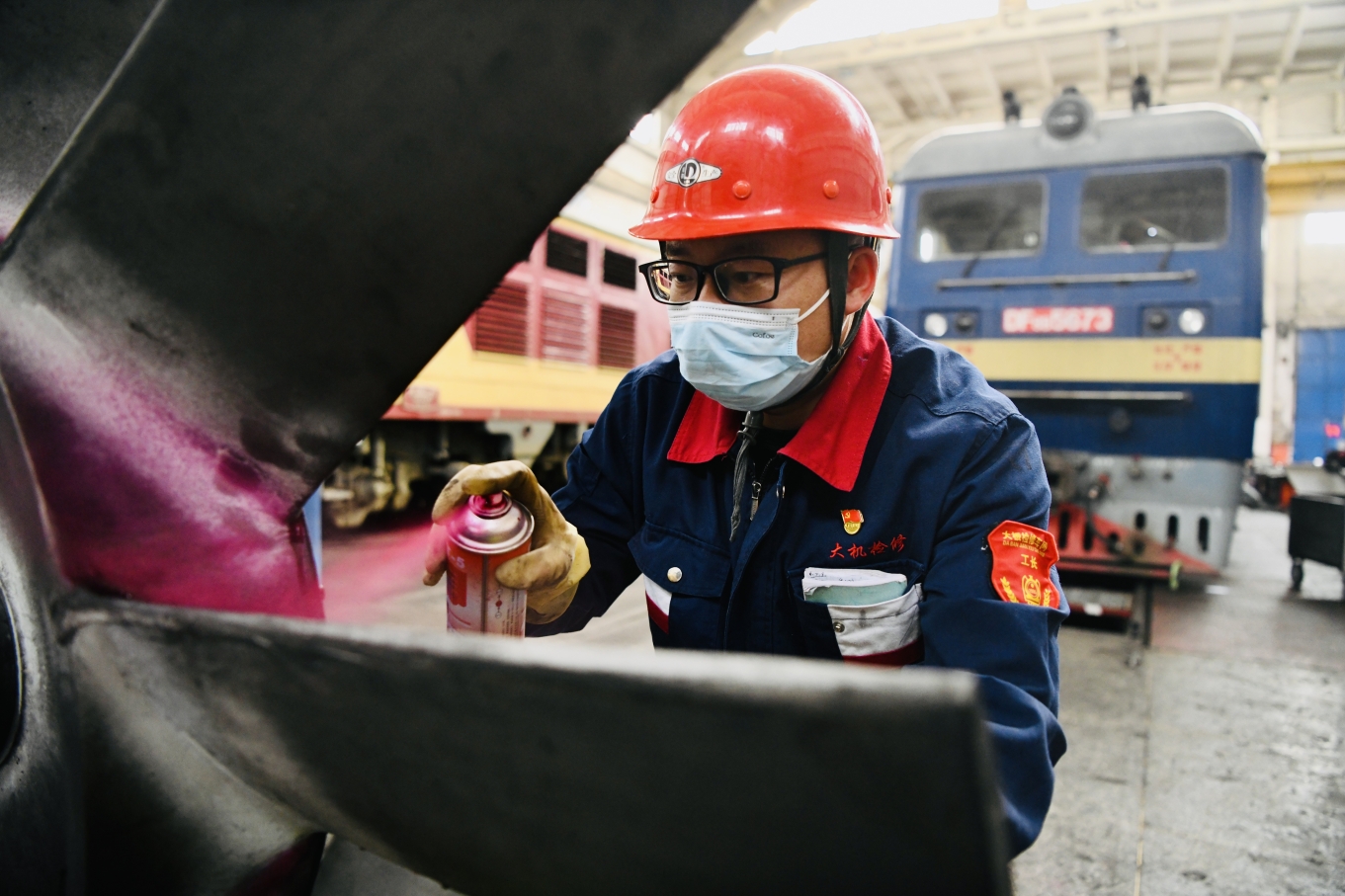 (大板机务段检修车间职工复测曲轴轴径。牛鹏成 摄)