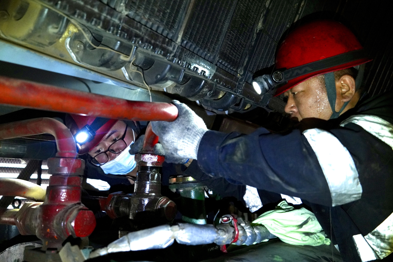 (大板机务段检修车间职工对冷却水系统温控阀进行检查更换。牛鹏成 摄)