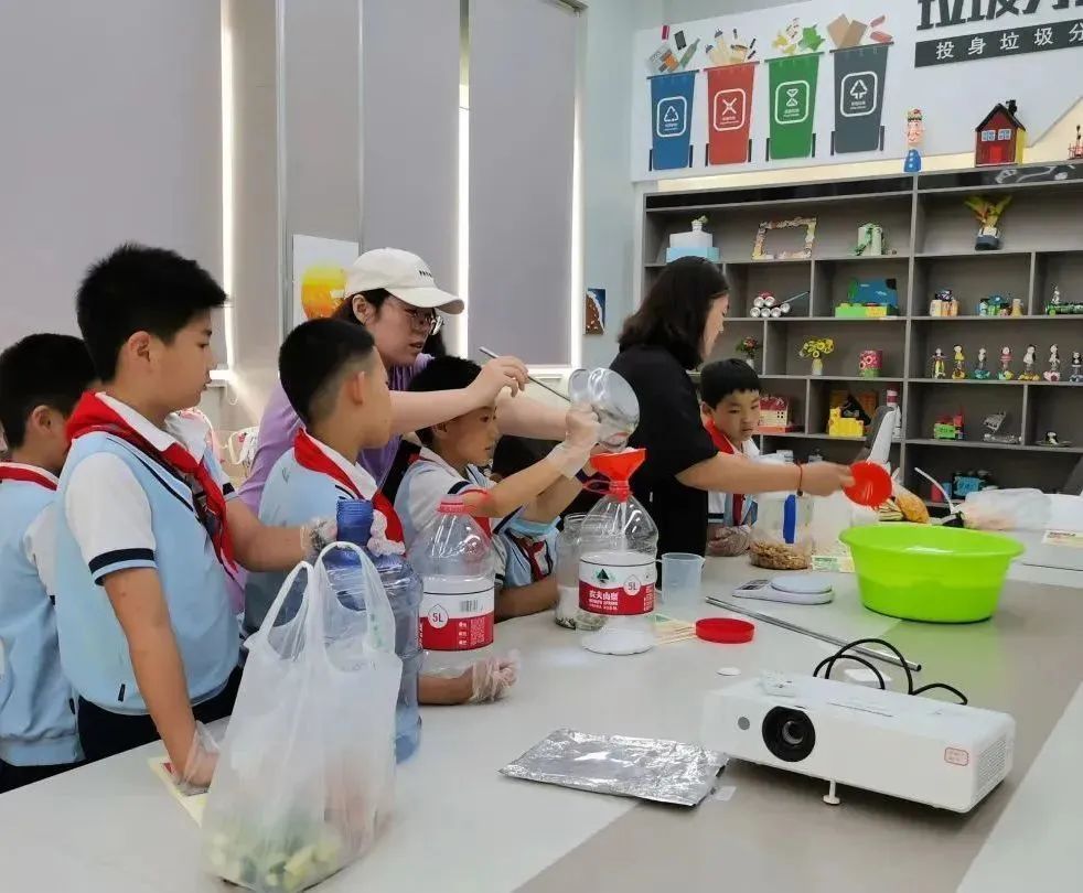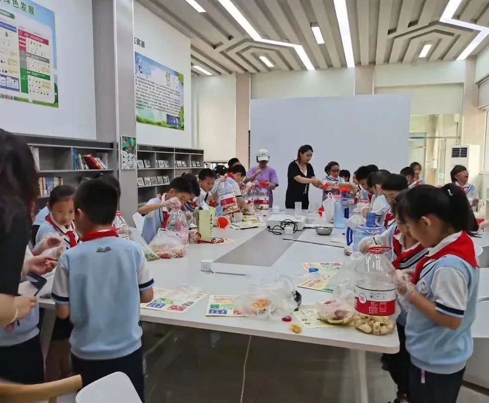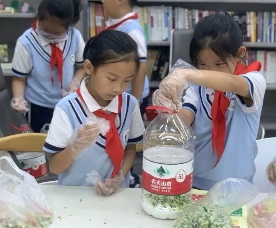 为了让队员们深刻体会合理利用厨余垃圾以及如何让垃圾变废为宝,校外辅导员老师还特意安排了酵素制作环节。通过讲解,队员们认识到厨余垃圾发酵后产生的酵素对人体健康、消除公害、粮食增产等起到积极作用,并学习制作果皮酵素,在动手制作中充分体验到参与的乐趣与满满的成就感。