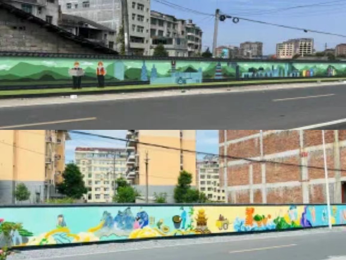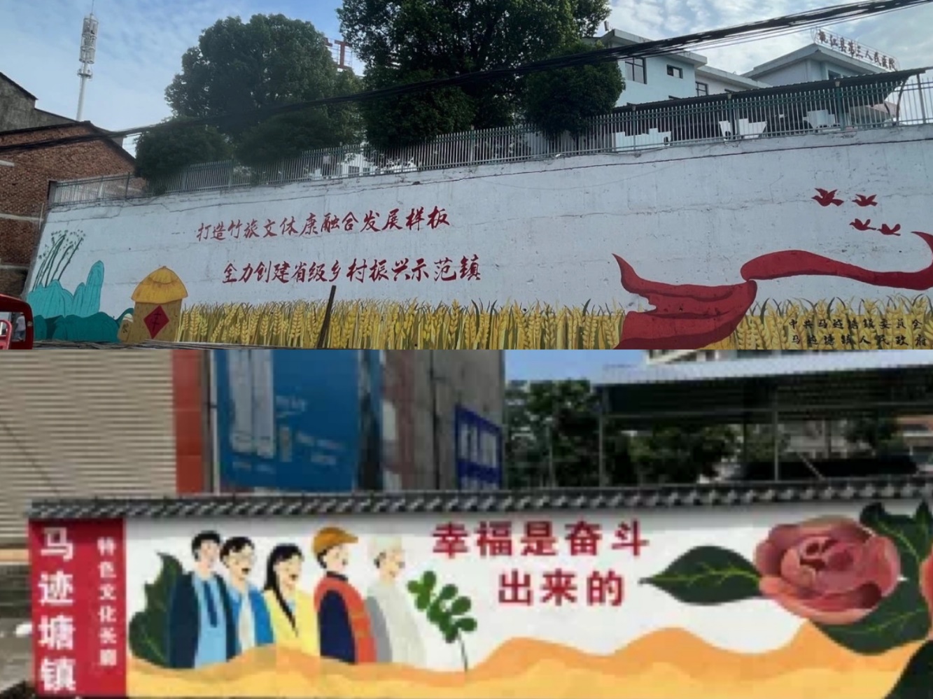 “乡村改造家”社会实践队来到马迹塘镇后,经过与镇村干部进行沟通了解,以马迹塘特色文化、支柱产业、党建引领等为内容,设计打造了1800余平方米的特色墙绘。