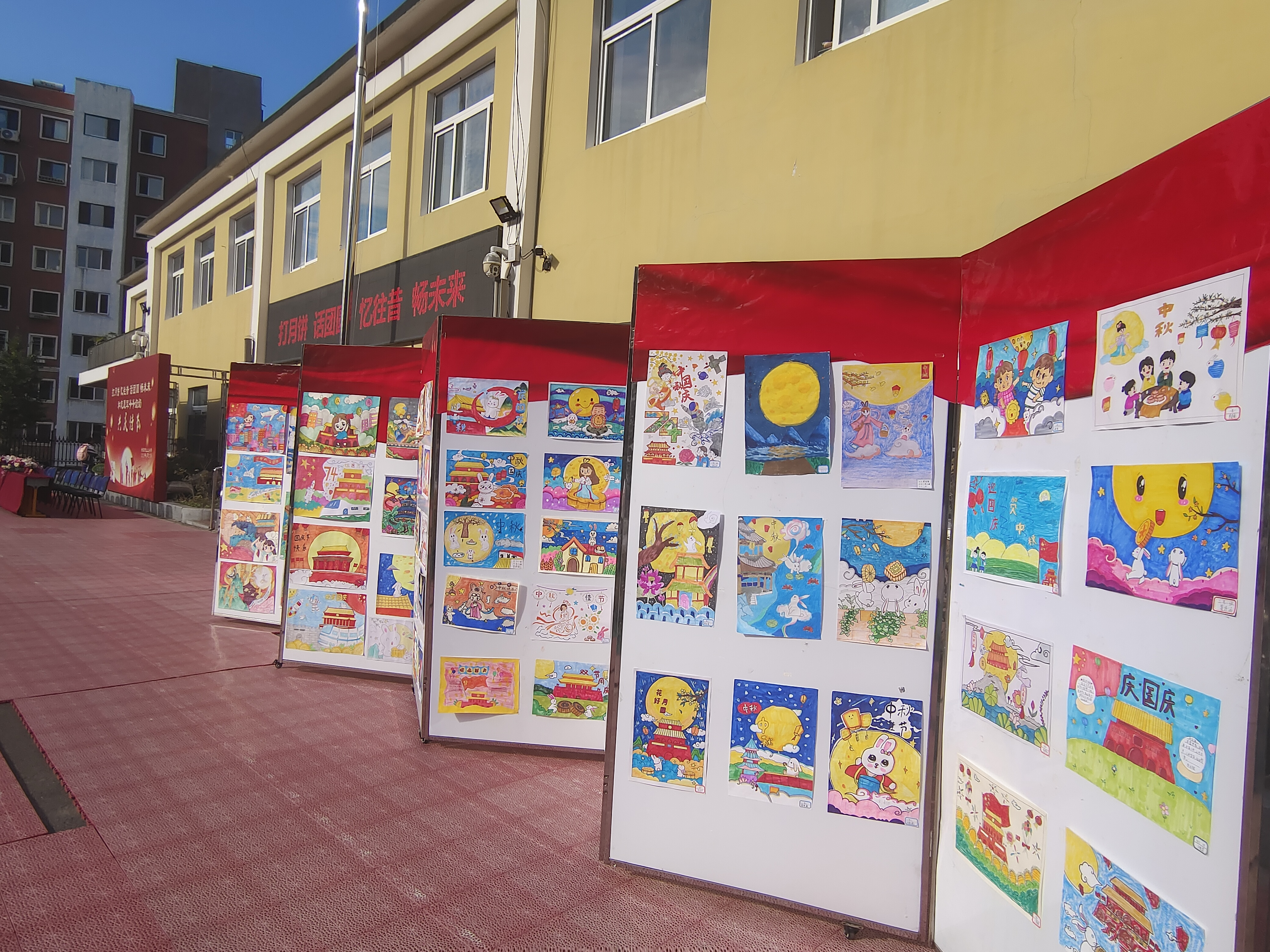 同学们制作的“迎中秋庆国庆”精美小报,一一展示在展板上,又将亲手制作的贺卡挂在长廊的树下,共同祝愿伟大的祖国繁荣昌盛,人民幸福安康。校园内到处洋溢着节日的气氛!
