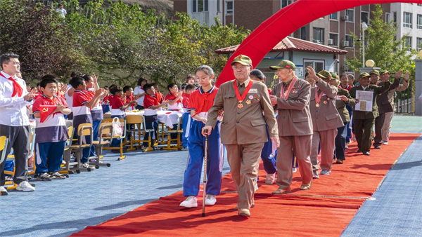 在全校师生热烈的掌声中,伴随着一曲深情的《我和我的祖国》,志愿军爷爷奶奶踏着红毯来到会场,少先队员向最可爱的人致敬,并为他们佩戴红领巾!