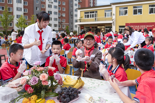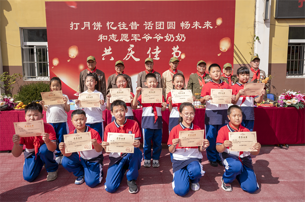 志愿军爷爷奶奶走到同学们中间和大家一起打月饼,小小的月饼裹上浓浓的祝福,包上满满的情意。灿烂的文化在大手与小手间传承;小小的月饼承载了万家灯火的天伦之乐,也承载了穿越千年的悠悠文化。喜悦的心情洋溢在每个人脸上!