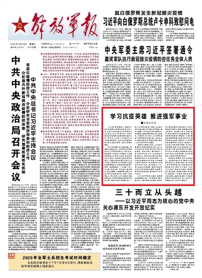 解放军报评论员:学习抗疫英雄 推进强军事业