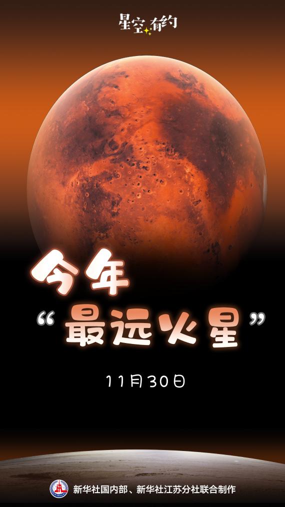 一分钟看天下摘要:11月30日,火星将运行至本轮会合周期中距离地球最远的位置,与地球大约相距2.424个天文单位,约合3.63亿千米。届时,火星、地球与太阳近似排成一条直线,火星位于太阳背后,这也是今年地球迎来的“最远火星”。