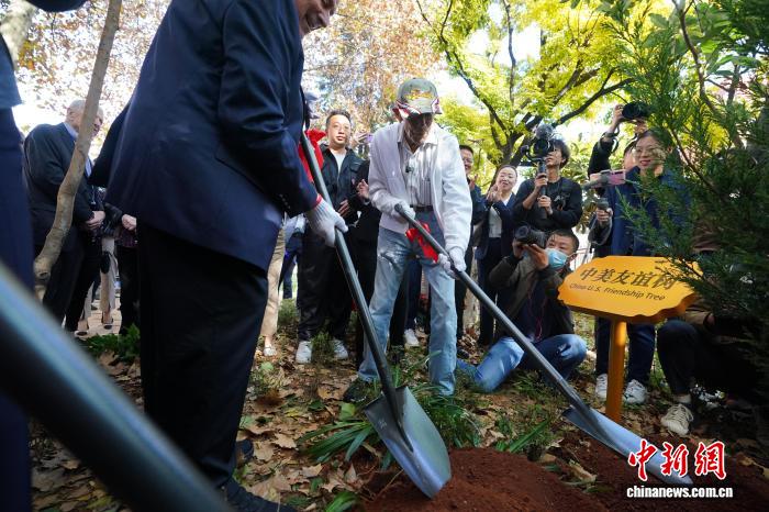 2023年11月3日,美国飞虎队老兵哈里·莫耶在昆明与中方代表共植友谊树。中新社记者 刘冉阳 摄