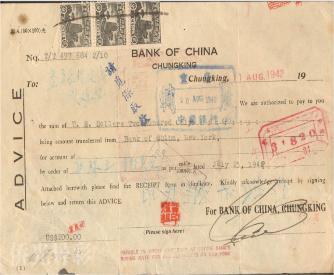 1942年司徒美堂和郭琼之为救济祖国难民、支持中国抗战而汇往中国的银行汇款单。(中国华侨历史博物馆供图)