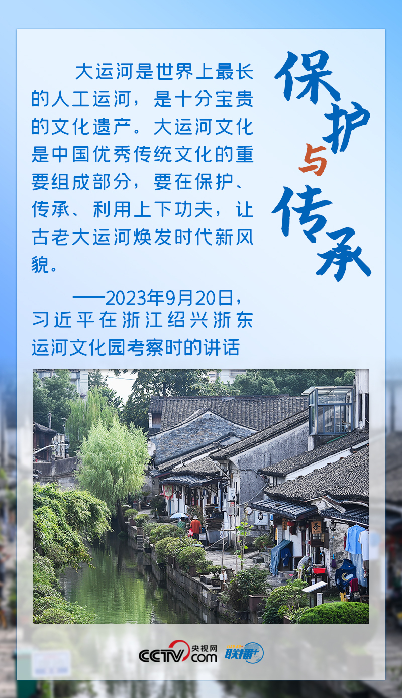 习近平总书记一直心系大运河保护、传承与利用工作。2017年,他对建设大运河文化带作出重要指示,明确指出“要统筹保护好、传承好、利用好”大运河。此次考察,总书记再次强调“要在保护、传承、利用上下功夫”。保护、传承、利用是辩证统一的,保护是前提,利用是过程,传承发展是目的,三者相互依存,方能彰显价值。文化遗产是先人创造并遗留下来的宝贵财富,是一个国家和民族文明延续的内在脉络与创新创造的动力源泉。在保护的基础上研究利用好这些人类文明的瑰宝,才能更好做到传承发展。