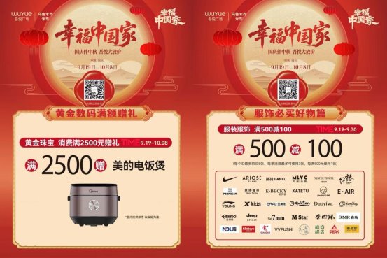 为让市民在欢乐祥和的国庆氛围中尽享购物乐趣,米东吾悦广场携手场内近200家品牌,精心打造"幸福中国家"主题促销活动,以实实在在的优惠回馈广大消费者。此次促销力度空前,涵盖了日用百货、黄金珠宝、服装服饰、数码家电等多个品类,力求让每位顾客都能乘兴而来、满意而归。
