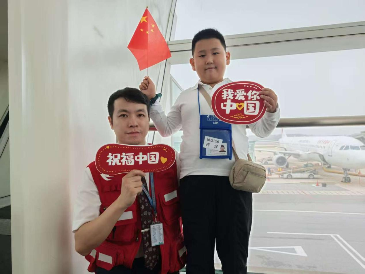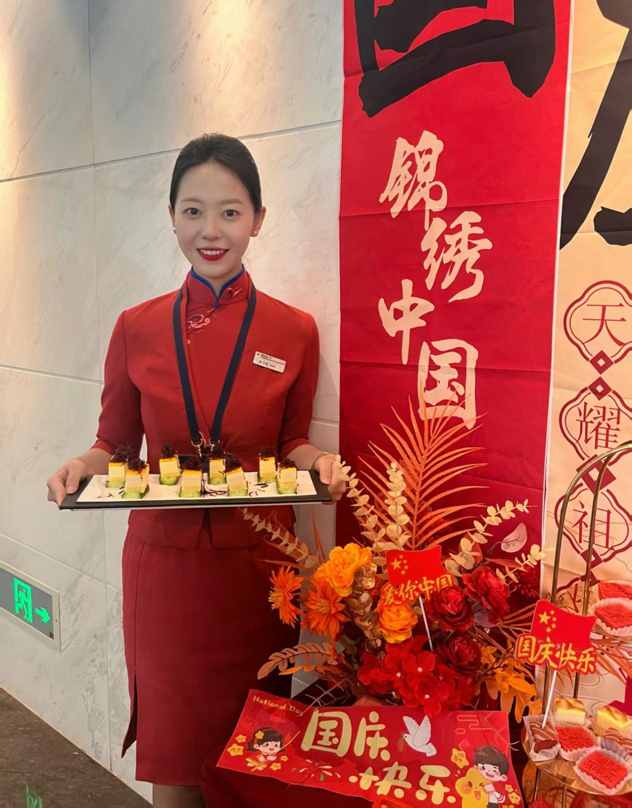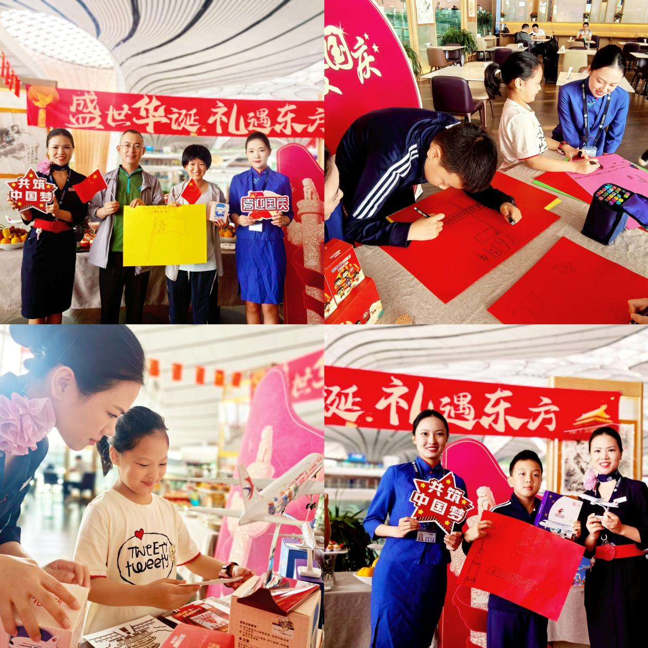 国庆节当天,东航北京分公司精心策划并开展了一场特色服务活动,以真情服务传递家国情怀,为旅客的旅途增添了浓浓的节日仪式感与温暖。大兴机场东航值机区域,柜台被鲜艳的五星红旗和节日装饰点缀一新,精心布置的“国庆主题打卡点”吸引了众 多旅客驻足,大家纷纷与家人朋友合影。大兴机场休息室以“盛世华诞,礼遇东方”为主题,为旅客打造了一场兼具仪式感与温情的国庆盛宴。