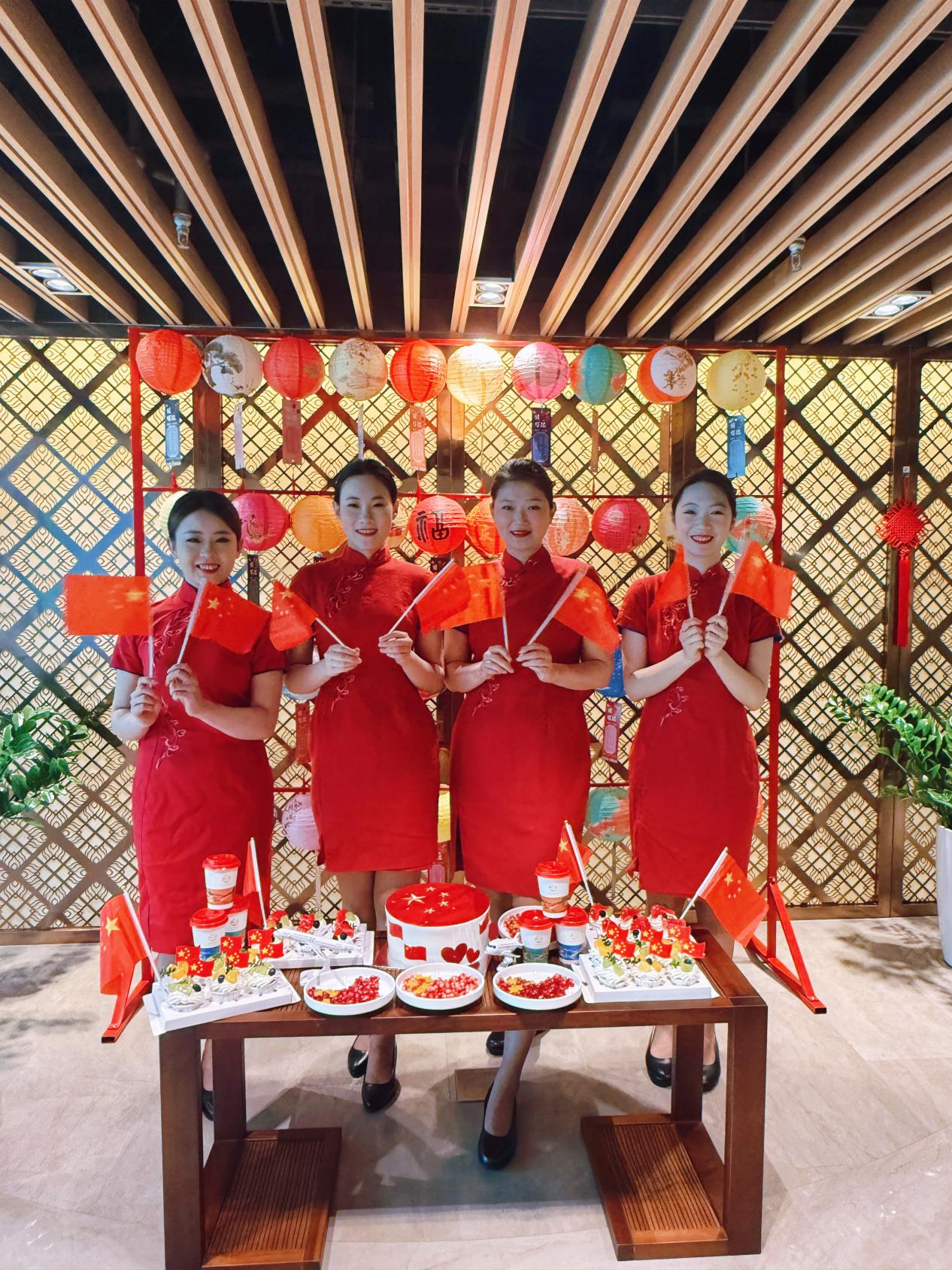 10月1日,在咸阳国际机场T5航站楼东航V20贵宾厅,东航西北分公司两舱休息室服务人员与外籍旅客一起共庆佳节。