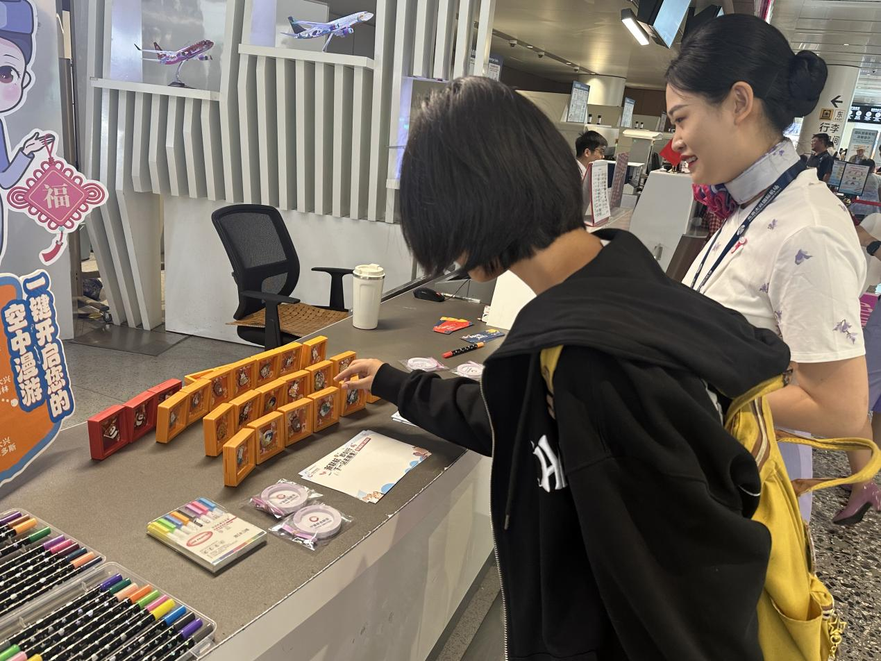 国庆节当天,东航武汉公司地服部在值机柜台、登机口开展互动活动。
