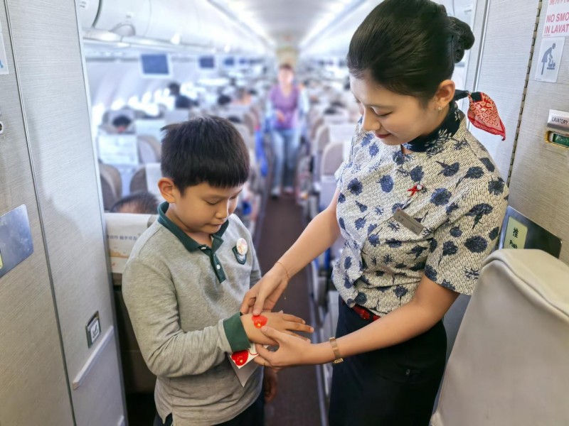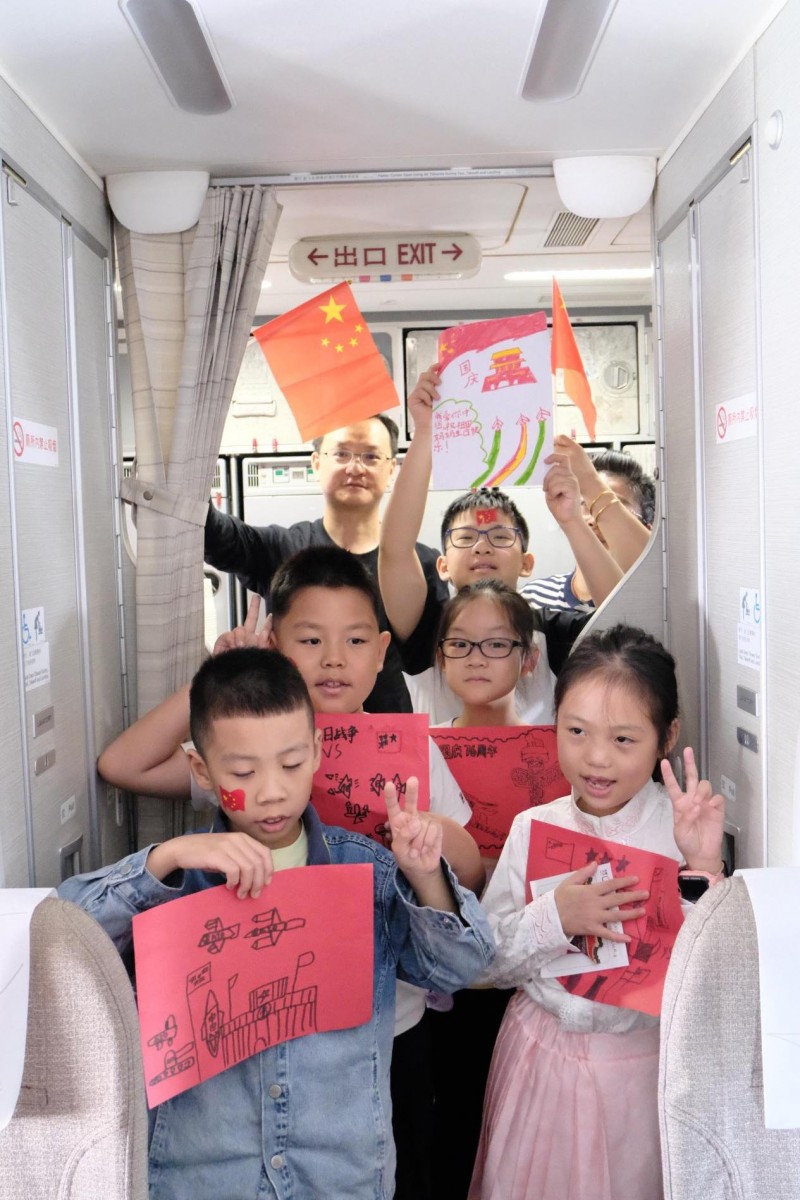 在MU5327济南-昆明的航班上,东航山东分公司的乘务员们与可爱的小旅客们开展温馨互动。小小的客舱里,孩子们挥舞着五星红旗,清澈的眼眸中映照着最美的“中国红”。一场专属于万米高空的“爱国启蒙小派对”,在欢声笑语中,将热爱祖国的种子悄然播撒在心田。