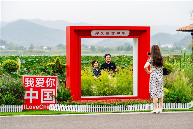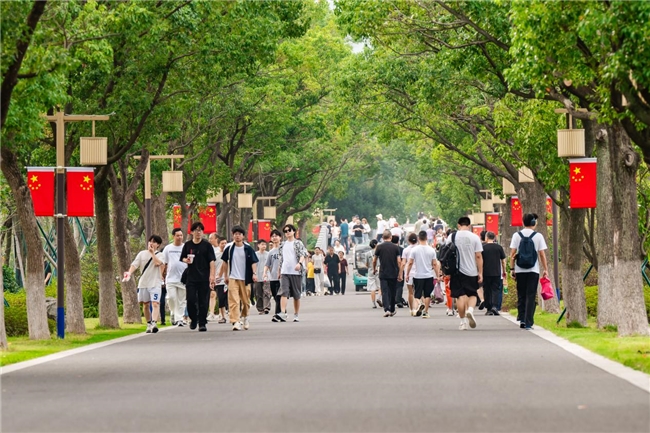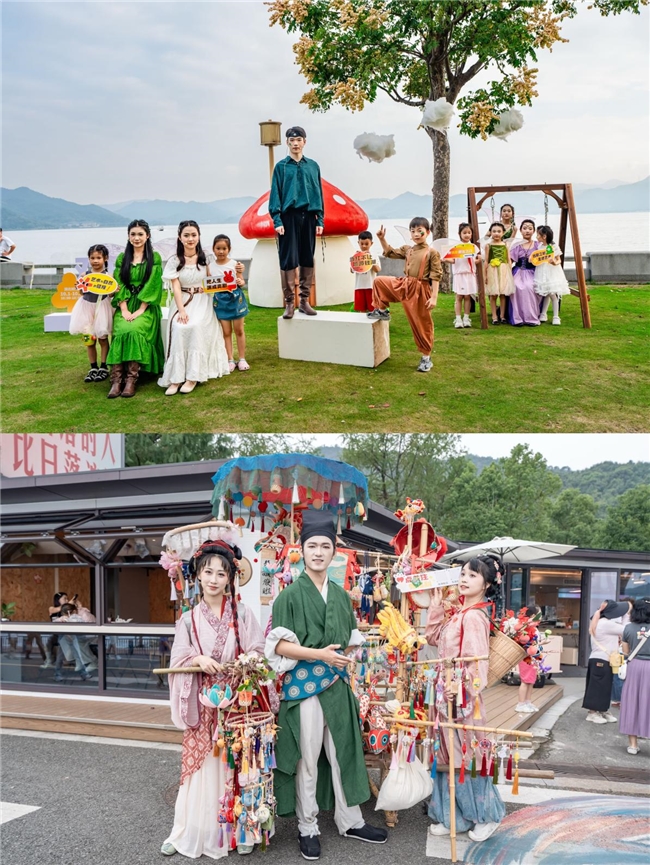 东钱湖处处是“红”的惊喜,钱湖秘境的合影框前站满了人,游客们纷纷驻足互动,相机定格了“热爱祖国”的瞬间;南湖岸线,木偶兔与提线木偶灵动演绎,孩子们追逐欢笑,大人也重拾童真;宋朝卖货郎的吆喝声里,诗词互动成为热门打卡项,充分展现了文化自信的当代活力。“带孩子来感受国庆氛围,没想到这么有戏!”游客张女士赞叹道,“红得有温度,戏得有深度,是一次难忘的出游体验。”