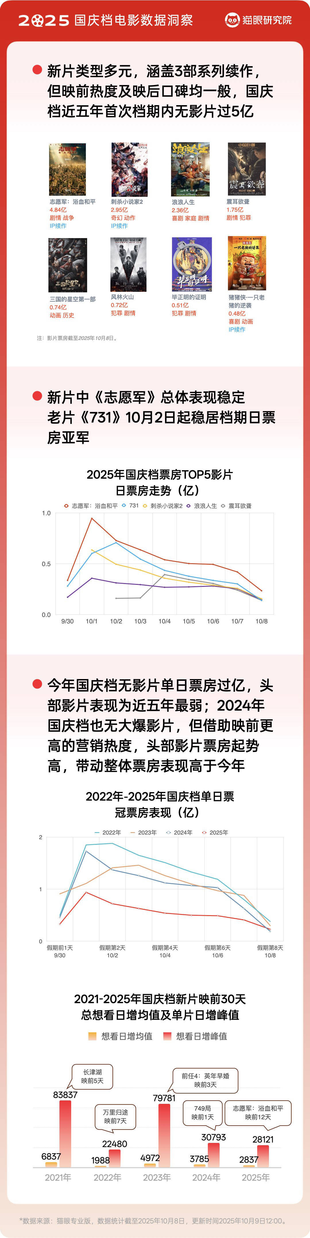 10月9日,猫眼研究院发布《2025国庆档电影数据洞察》(以下简称《洞察》)。《洞察》显示,今年国庆档新片供给丰富、类型多元,但由于缺乏爆款头部影片的带动,吸引力稍显不足,市场表现相对黯淡。不过,多部影片在细分受众及降价惠民等方面仍呈现出积极亮点。