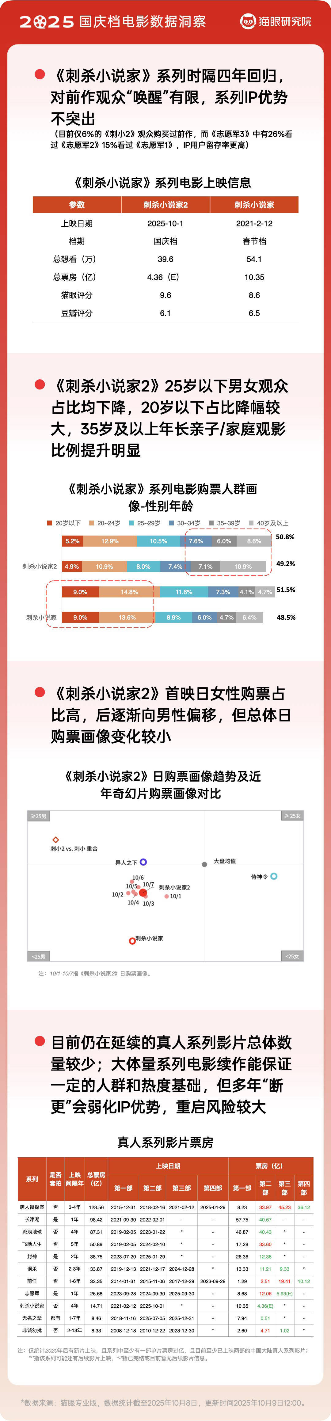 从单片表现来看,由于新片整体热度一般,档期内无影片票房破5亿。两部IP续作成今年国庆档新片票房主力:《志愿军:浴血和平》以4.50亿的档期票房成绩领跑,表现相对稳健;奇幻动作片《刺杀小说家2》档期内收获2.95亿票房,位列新片第二。从市场反馈来看,大体量系列电影续作能保证一定的人群和热度基础,但如果上映间隔时间较长则会削弱IP的系列优势。如《刺杀小说家2》与前作时隔四年,导致未能大比例唤醒前作观众的观影热情,IP用户留存率远不及“志愿军”系列。此外,老片中《731》凭借其题材和热度,档期内表现坚挺,位居整个国庆档票房亚军。