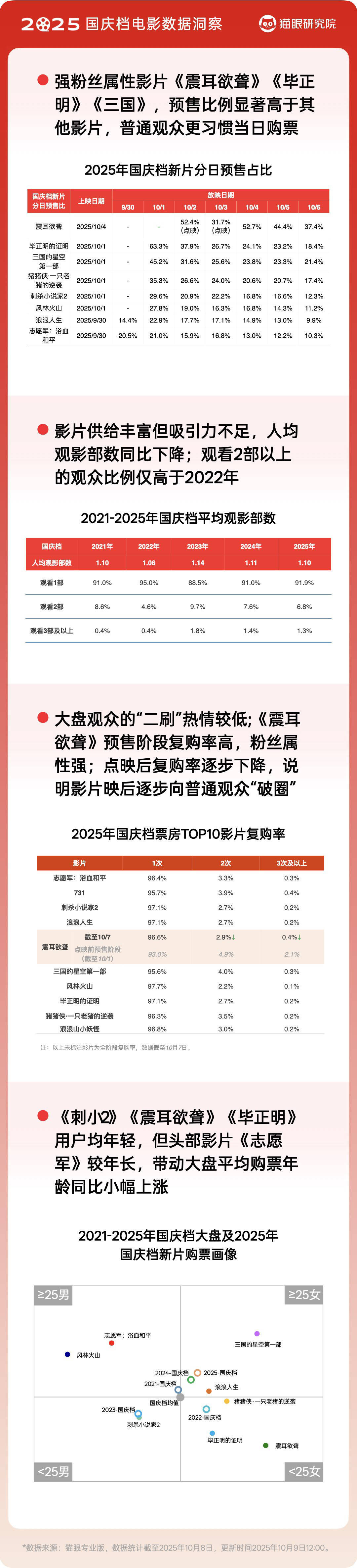 用户行为方面,人均观影部数同比下降。从购票张数来看,“社交属性弱”的趋势延续,双人观影比例下降,而单人观影比例则达到近五年最高。其中,影片《震耳欲聋》的单人观影比例近五成,粉丝属性明显。而《志愿军:浴血和平》《三国的星空第一部》等影片多人观影占比较高,家庭观影属性较强。在受众结构上,今年国庆档新用户占比略高于去年,但主要是由于《731》的拉动。新片中《猪猪侠·一只老猪的逆袭》《震耳欲聋》的新用户及低频用户占比较高,而《风林火山》的高频用户占比最高。