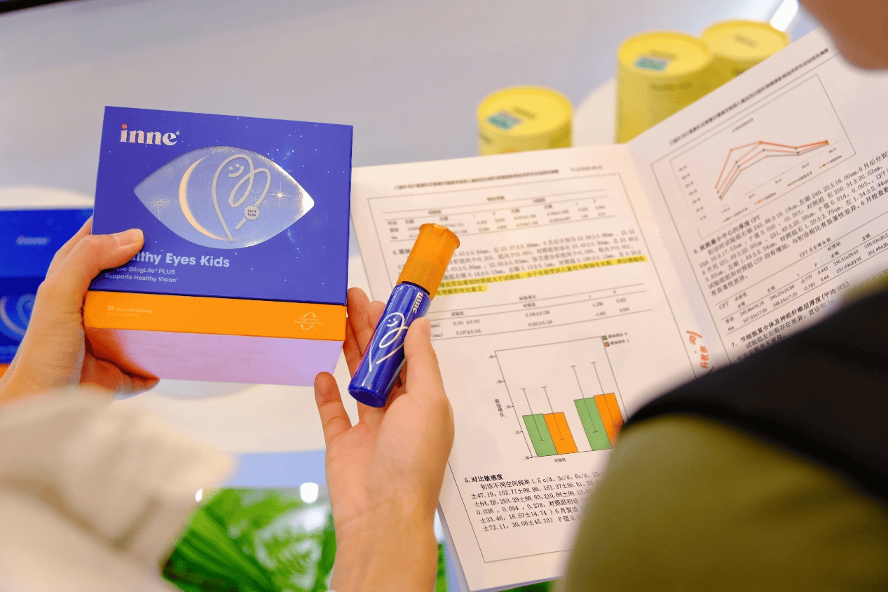 其中,inne分龄护眼系列产品受到重点关注。针对学龄前儿童的蓝光盾®护眼软糖和针对学龄期儿童的视立棒®护眼饮,均经过临床研究功效支撑。据了解,2024年,inne与南京同仁医院联合开展了一项针对儿童补充叶黄素与花青素对视觉功能影响的临床研究。研究数据显示:服用inne叶黄素和花青素补充剂,有助于维护孩子视网膜和黄斑健康,并对延缓眼轴增长具有积极作用,对儿童眼健康产生正向保护作用。该项成果发表于第25届国际眼科学学术会议(COOC),受到国际眼科学专家认可,为营养干预在儿童视力防控中的应用提供了循证依据。