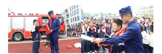 沉浸式体验环节亮点纷呈:许童英副校长为消防员代表颁发少先队校外辅导员聘书;消防宣传员展示消防服、灭火器等装备,讲解操作原理,指导学生试穿消防服、试戴面罩,亲身体验消防员工作;现场演示灭火器 “一提、二拔、三握、四压” 使用口诀,组织学生实操;拆解消防水带对接、水枪使用等技能,邀请学生上手体验;开放消防车供师生参观,揭开专业装备 “奥秘”。