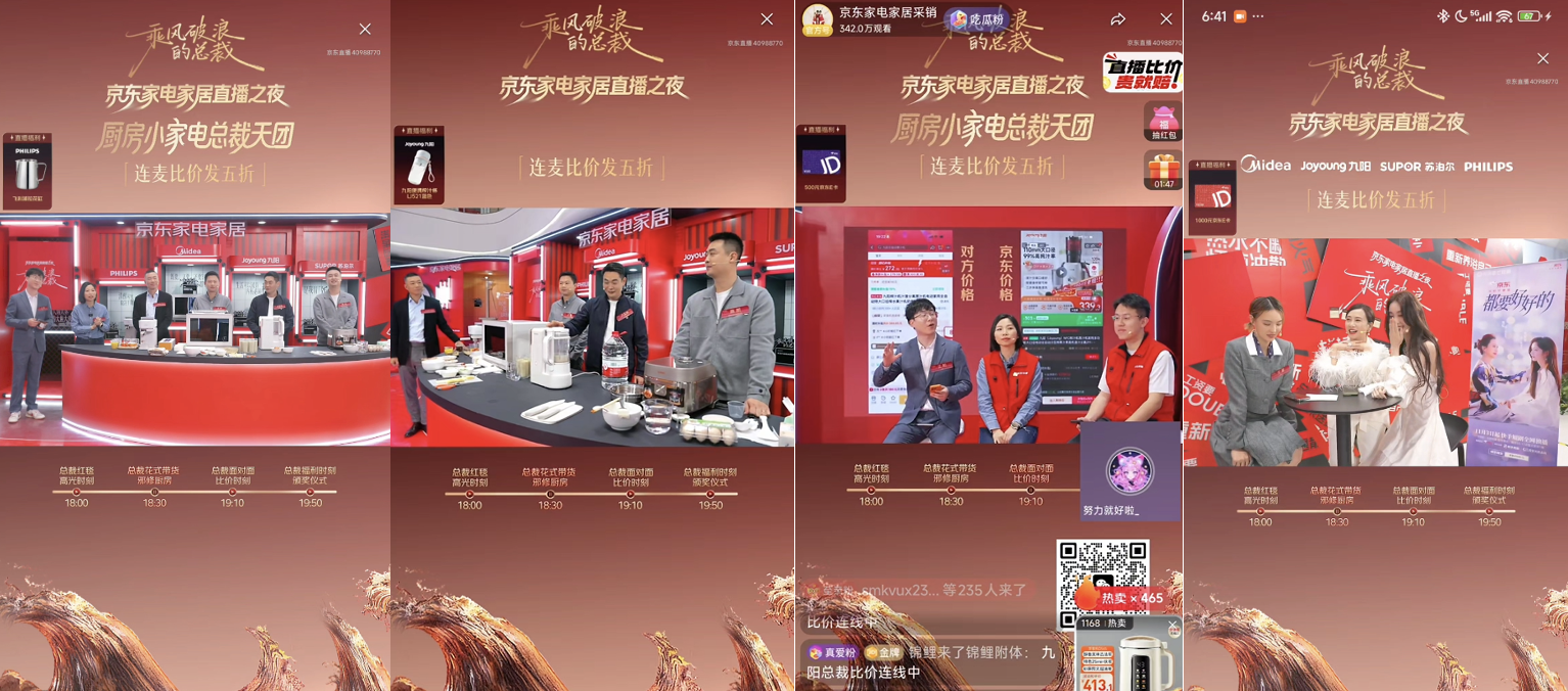 在各专场直播中,场景化体验也成为一大亮点。厨房小家电专场,美的微烤事业部国内营销总经理王凯现场演示美的寻味Pro 3.0微蒸烤炸炖一体机的“上烤下蒸”同步烹饪技术;九阳品牌总经理卢孟林展示九阳料理大师静音破壁机B1U的低噪性能;苏泊尔京东业务总监陈凯利用苏泊尔旋焰釜蓬蓬煲现场制作江西水蒸蛋;飞利浦家电大中华区销售负责人Gaven Chen呈现飞利浦Baristina新型自动咖啡机的瞬热萃取科技。明星嘉宾翁虹、戚砚笛的加入、“比价环节”现场连麦用户进行全网比价并同步送出福利,以及“买贵必赔”承诺,增强了用户参与感与信任度。