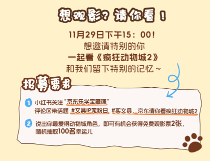 即日起,参与线上活动,就有可能获得京东请客看《疯狂动物城2》电影的名额。参与形式非常简单——在小红书关注“京东乐学宝藏铺”,在评论区带话题#文具IP宠粉日 #买文具,并分享你最喜爱的动物城角色,即有机会成为100名幸运观众之一,赢取《疯狂动物城2》免费观影票2张。开奖时间为11月27日,赶快行动起来,别错过与动物城角色大银幕相见的机会。