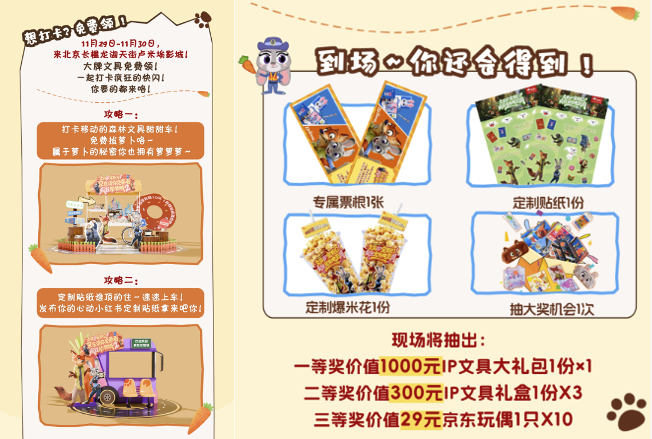 线下活动现场同样精彩不断。11月29日至30日,在北京长楹龙湖天街卢米埃影城,京东请幸运用户观影的同时,还精心打造“森林文具甜甜车”主题打卡点。现场观众不仅可获赠《疯狂动物城2》专属票根、定制贴纸和定制爆米花各一份,还可参与现场抽奖,千元IP文具大礼包、IP文具礼盒、京东玩偶等惊喜奖品等你来拿,让观影之旅更具仪式感,把动物城的可爱回忆统统带回家。