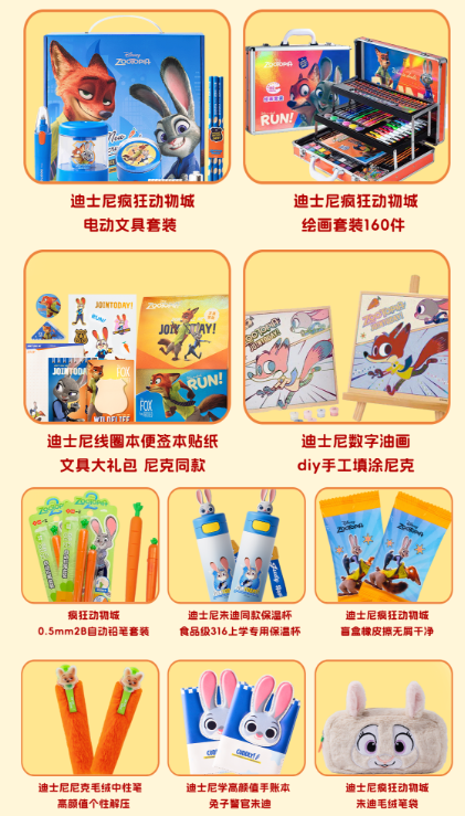 此外,还有华东理工大学出版社的《疯狂动物城2》限定套装,绘本与英语学习完美结合;一正《疯狂动物城》2B自动铅笔套装,以及迪士尼系列文具,包括电动文具套装、绘画160件套、线圈本便签本贴纸大礼包、数字油画、朱迪同款保温杯、盲盒橡皮擦、毛绒中性笔、高颜值手账本、毛绒笔袋等丰富品类……从图书到文具用品再到绘画工具,应有尽有,满足学习、记录与创作所有需求。