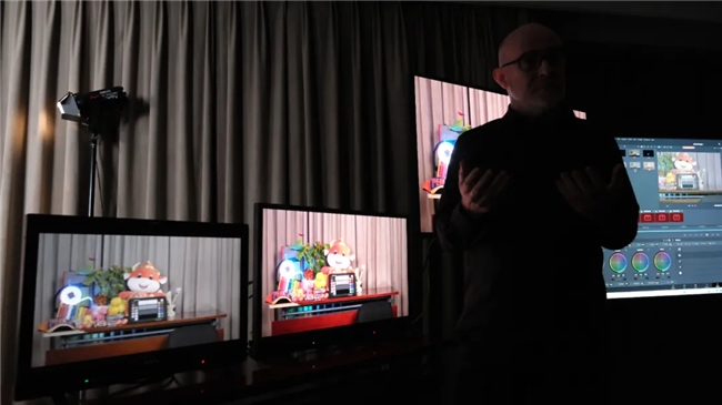 Paul 老师结合人眼视觉认知原理,现场演示摄影机画面的实时调色方法。左一监视器显示 SDR,左二显示HDR