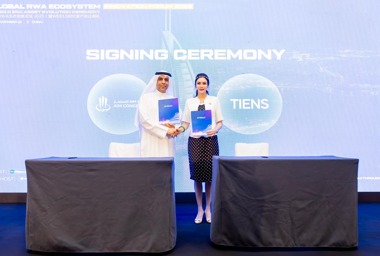 大会最具战略意义的环节,是阿联酋国际投资峰会AIM 与天狮集团 、VMOMENT 三方战略合作协议的正式签署。此次合作将围绕数字资产基础设施建设、AI智能健康生态打造以及跨境商业体系协同展开,标志着天狮正式步入由数据驱动、科技赋能的全球化战略阶段。签约瞬间,全场掌声与欢呼声持续不断,象征着天狮未来的国际化路径更加坚实与明确。