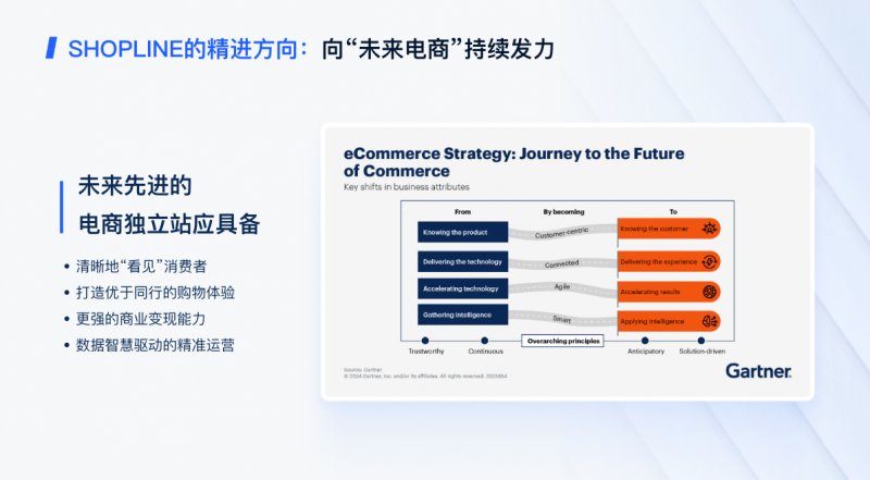 在一天高密度的思想碰撞中,生态伙伴们输出了大量前沿洞察与实战经验,获得了与会者的广泛好评与共鸣。全天的分享围绕一个关键共识展开:一个面向未来的电商独立站,必须构建四大核心能力——清晰地“看见”消费者、打造优于同行的购物体验、更强的商业变现能力,以及数据智慧驱动的精准运营 。这一观点与Gartner所定义的电商演进路径高度契合,标志着行业竞争正从“了解产品”转向“了解客户”,从“交付技术”迈向“交付体验”。