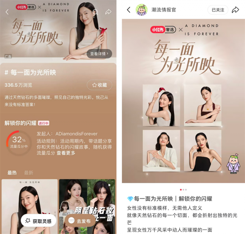 刷爆小红书、抖音的#天然钻石型格测试爆火一时。当Z世代彻底打破“天然钻石=婚恋”的刻板认知,天然钻石早已变身年轻人的“个性身份证”。#炽热行动派、#型格万人迷、#美学传承者、#理想逐光者四大话题标签席卷社交圈,从互动测试到真人晒单,从搭配攻略到成长故事,这场关于天然钻石的自我表达狂欢,正让每颗天然钻石都成为Z世代的“态度代言”。