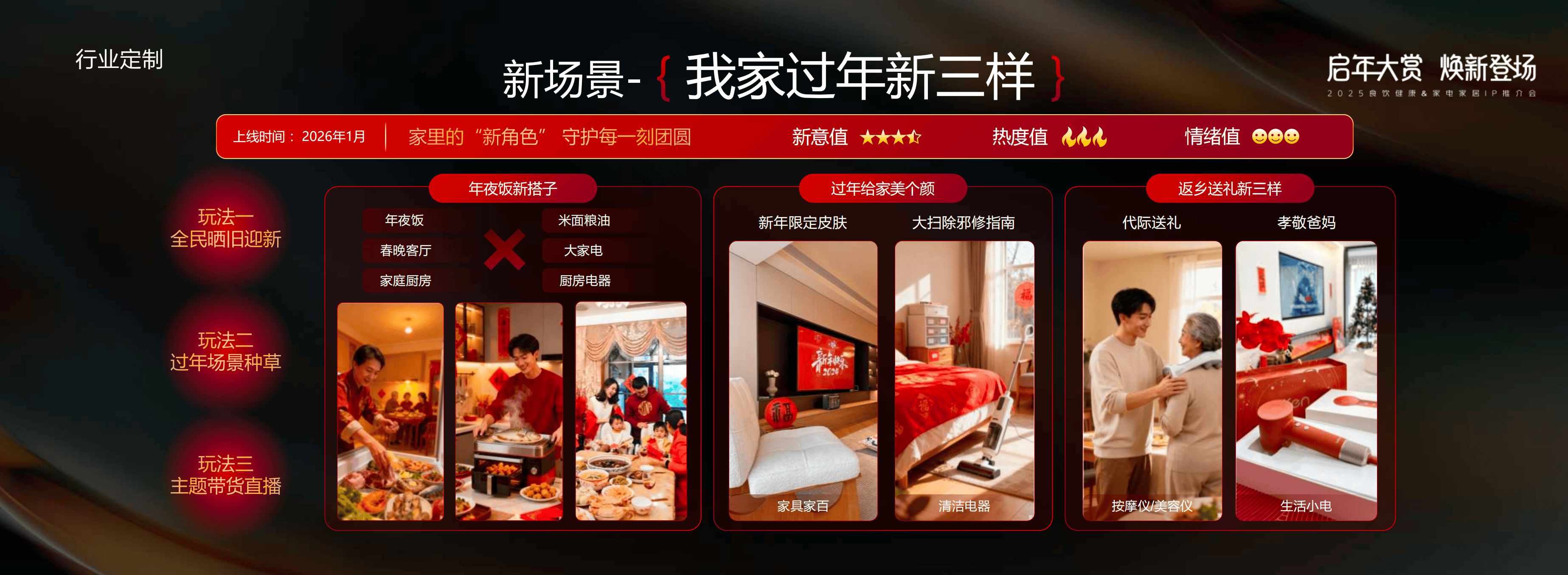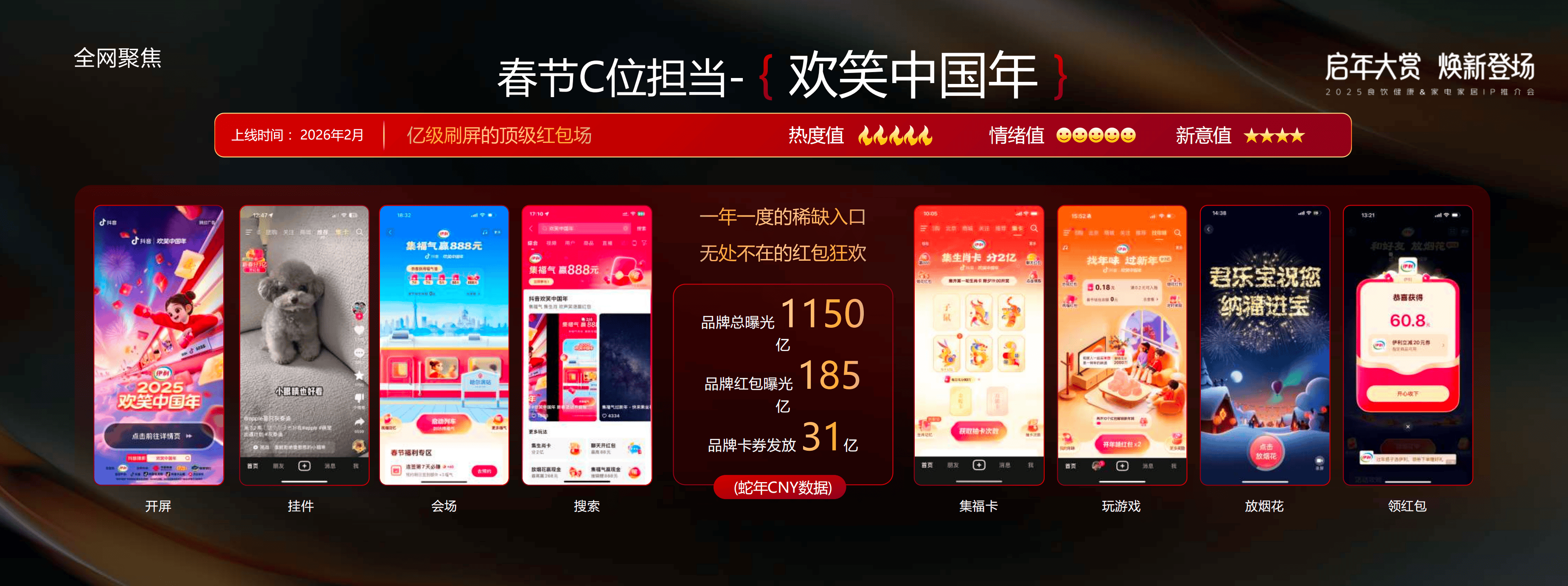 近日,巨量引擎在食饮健康&家电家居行业IP推介会上发布了2026年春节IP资源与策略,涵盖40余项重磅内容,从热点节点到垂类圈层,全面覆盖用户过年场景。值得关注的是,今年平台对IP进行全新升级,首次提供热度值、情绪值、创新值三大评估指标,为品牌提供更科学的决策参考。