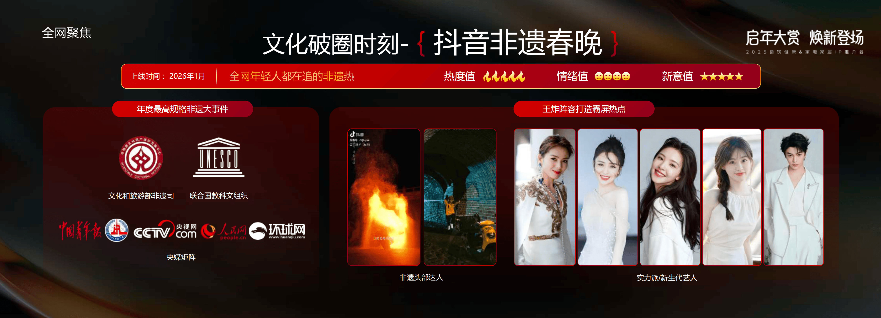 在近两年非遗文化热的背景下,2026年抖音将发起一场「非遗春晚」,由文旅部非遗司、联合国教科文组织、核心央媒共同背书,头部明星、抖音非遗头部达人携手国家级非遗传承人参与,将是一场年度最高规格的非遗大事件,届时还将联动米兰冬奥分会场,让传统文化海外破圈。对于有传统文化内涵、有出海传播需求的品牌,非遗春晚都是不可多得的顶配资源。