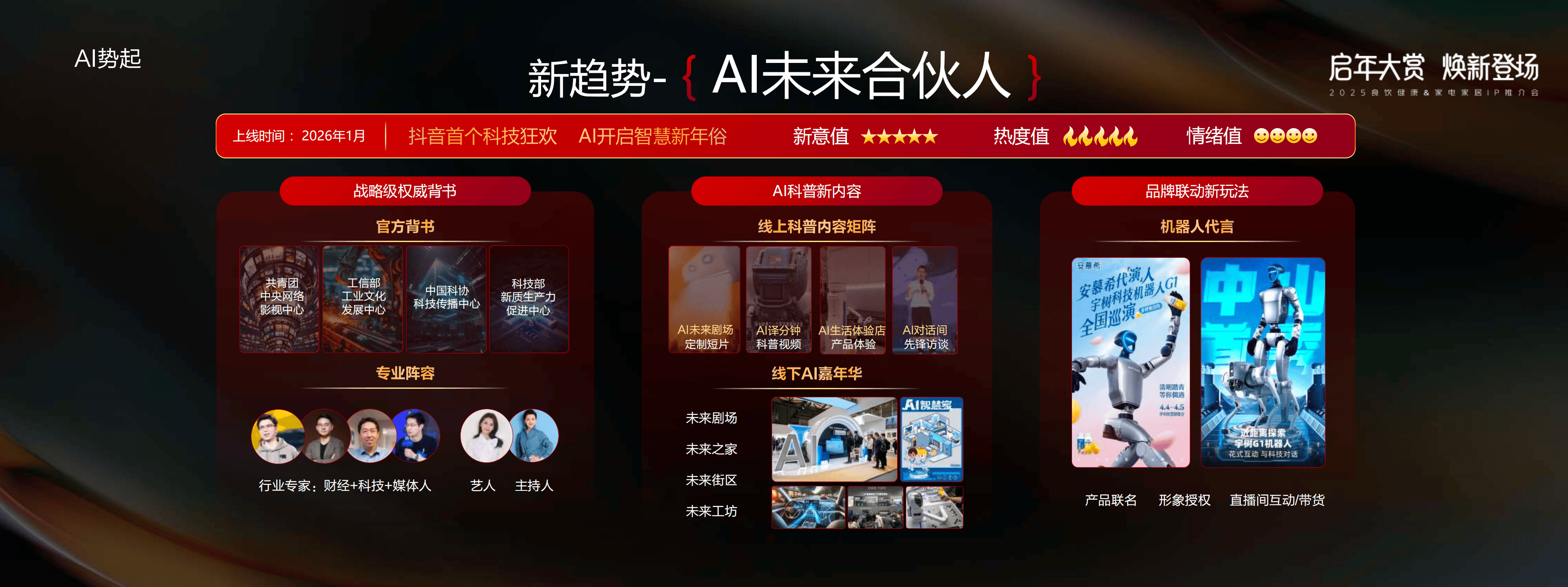 科技硬核爱好者也有自己的“春晚”,抖音将举办首次「AI未来合伙人」活动,邀请官方机构、媒体以及专家达人共同进行AI相关知识科普,通过线上科普内容和线下AI嘉年华结合,打造一场科技盛典。结合IP项目,平台将推出机器人代言新玩法,通过产品联名、形象授权、进入直播间互动等形式,让 AI赋能营销。