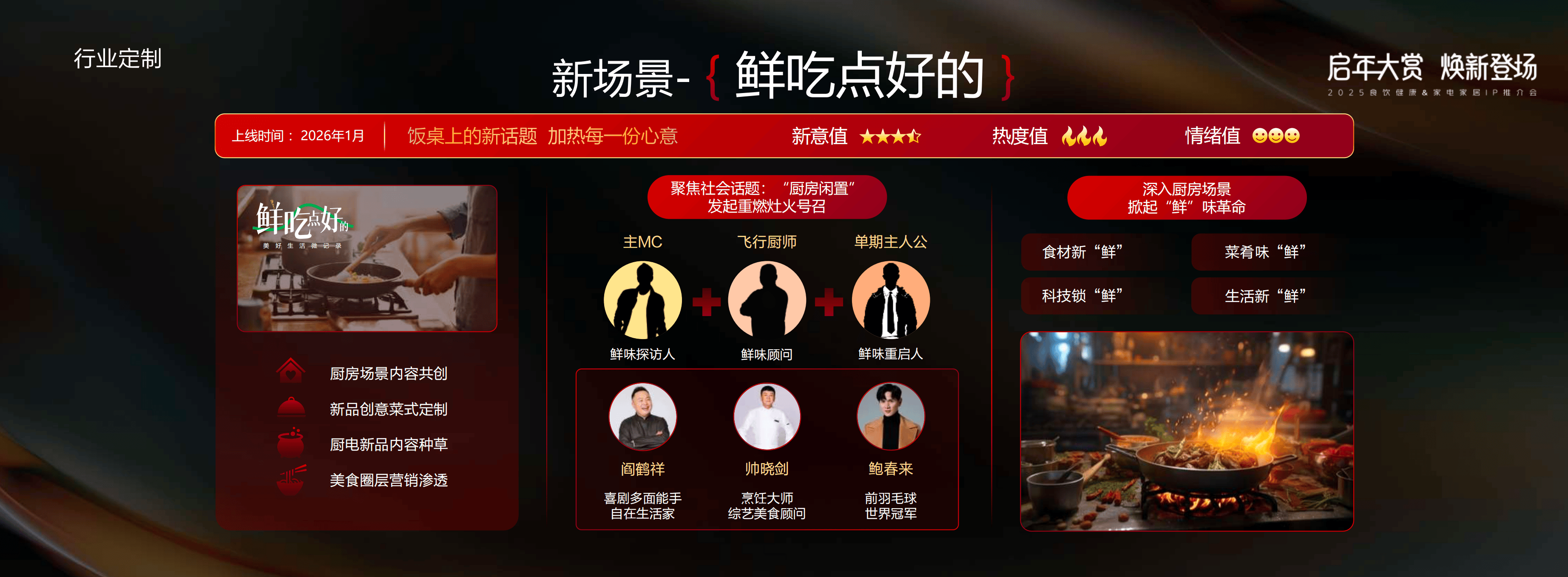 「鲜吃点好的」则是走进年轻人被闲置的厨房,通过重燃厨房的灶火帮助他们重启鲜活的生活,对于食品饮料、调味品、厨房用品等品牌均有种草空间。