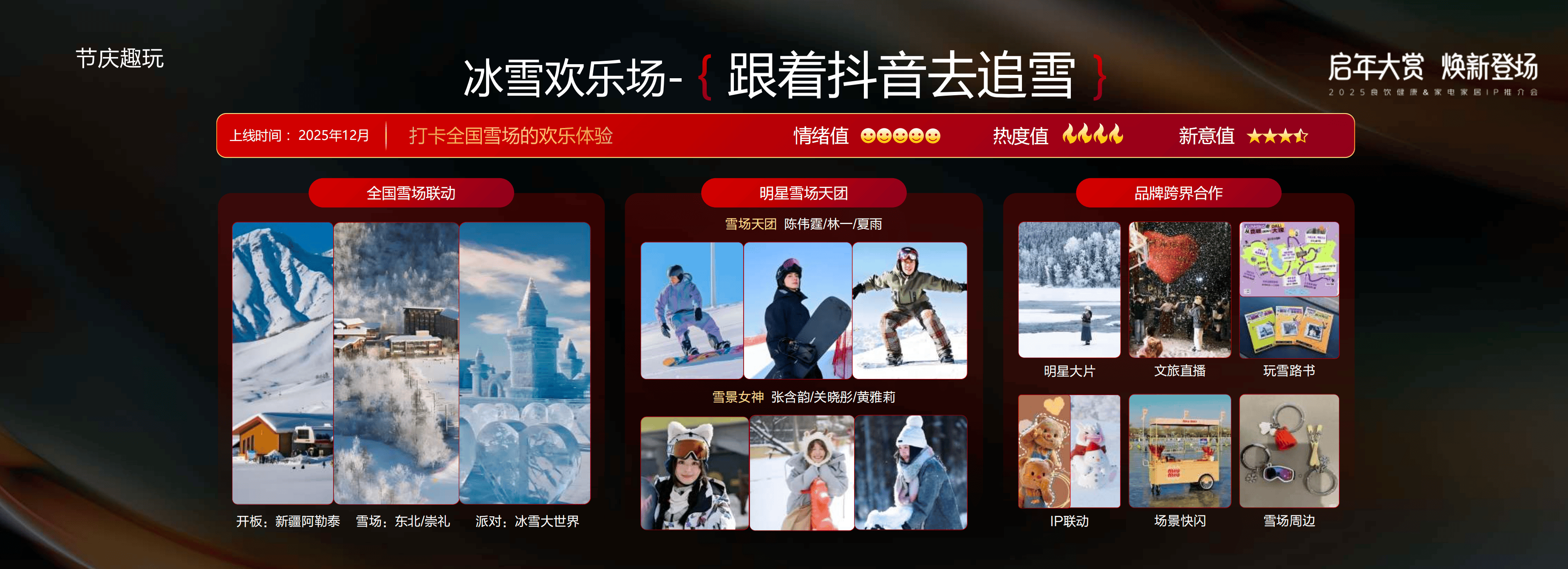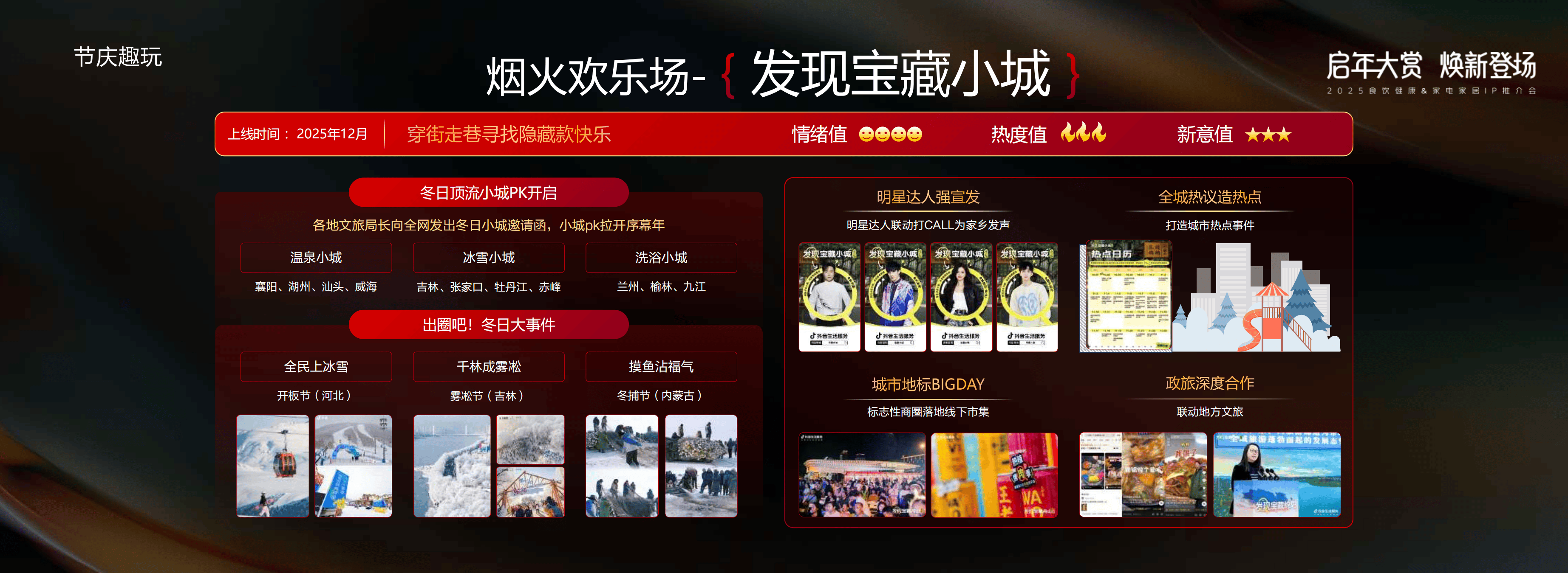 基于春节出游热点,抖音生活服务打造了「跟着抖音去追雪」「发现宝藏小城」等IP项目,前者与全国雪场以及哈尔滨冰雪大世界深度联动,展开线上内容和线下文旅全方位合作,为用户提供欢乐冰雪体验;后者则深入有特色的小城,譬如温泉小城、洗浴小城以及冰雪小城,带领用户走街串巷去寻找一些不踩雷的快乐。