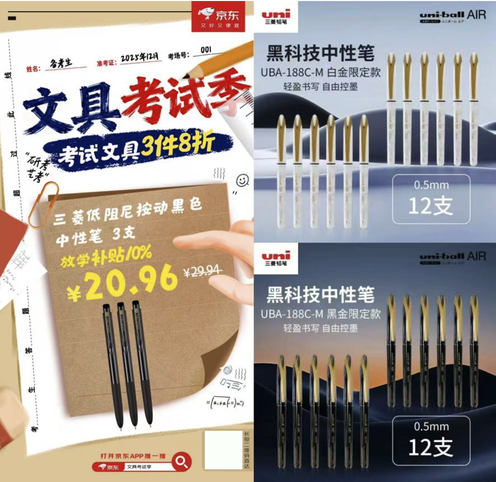 书写工具作为备考核心装备,直接关系到复习效率与答题体验。为此,京东文具严选多款品牌中性笔,均可叠加考试文具3件8折优惠和“文具3点半”放学补贴10%。例如这款三菱低阻尼按动黑色中性笔,流畅一体式设计,低阻尼感笔尖有效减少纸面摩擦,叠加放学补贴10%和3件8折优惠后,3支到手价20.96元;同为三菱的黑科技中性笔UBA-188C-M,书写时可调整力度与角度,自由掌控线条粗细变化,有白金和黑金两种颜色可供选择,12支活动到手价78.62元。