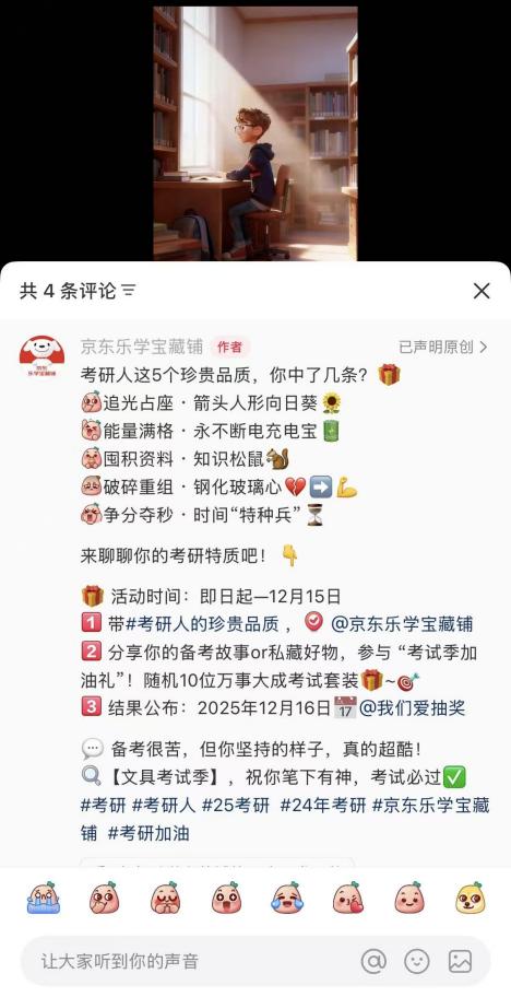 除了实在的购物福利,京东还发起#考研人的珍贵品质#话题分享活动,为考生开辟了一个分享鼓励的空间。即日起至12月15日,考生只需在小红书平台带话题#考研人的珍贵品质,并@京东乐学宝藏铺,分享自己的备考故事或私藏好物,即可参与“考试季加油礼”抽奖。京东将于2025年12月16日为随机抽取的10位幸运用户赠送寓意美好的“万事大成考试套装”。