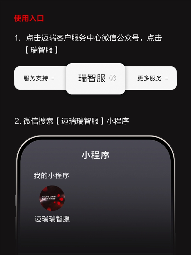 1、 点击迈瑞客户服务中心微信公众号,点击【瑞智服】