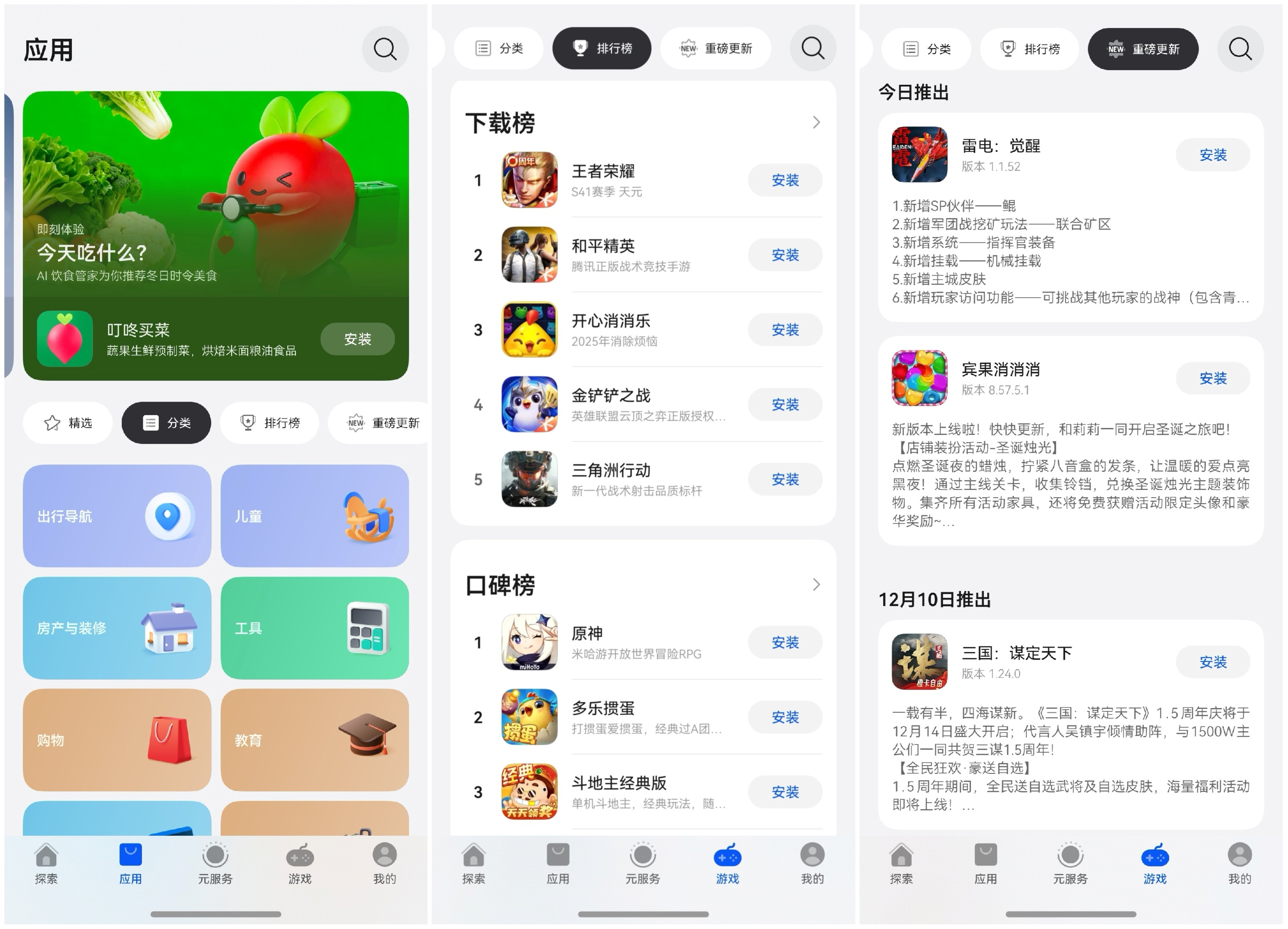 除了编辑推荐和直接搜索APP,还可以在“应用”或“游戏”页探索。通过“排行榜”类别筛选应用,可以到“下载榜”看人气,“口碑榜”看评价,快速筛选宝藏APP!在“重磅更新”列表,可以查看头部应用和游戏,近期在核心功能迭代、体验升级,重要更新一网打尽,第一时间享受优质体验!
