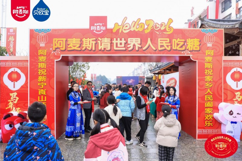 走进崀山景区北大门,“Amos阿麦斯请世界人民吃糖” “糖果叔叔请家乡人民吃糖”等巨幅标语格外亮眼,Amos阿麦斯、Biobor贝欧宝两大品牌特色打卡装置,与大红灯笼、中国结等新春元素交相辉映,迅速成为家乡人民及游客春节热门打卡点。景区游客中心、核心路段等多处电子大屏,循环播放着马恩多先生的新春祝福与诚挚邀约,言语间满是在外游子对家乡发展的牵挂与期许。“Amos阿麦斯请世界人民吃糖之崀山站”,作为金多多食品集团2026全球品牌战略落地的重要一站,不仅将品牌全球战略与桑梓深情紧密相连,更让每一位乡亲与游客都能感受到“从崀山走向世界,以甜蜜回馈崀山”的品牌情怀。